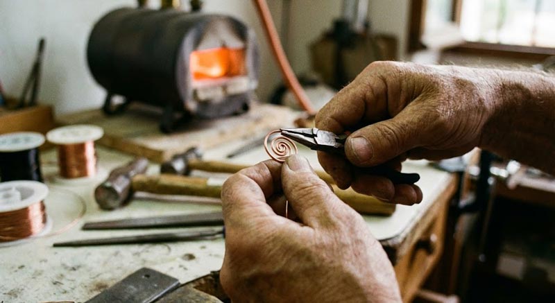 - خلق نقوش اولیه: هنرمند با استفاده از انبرهای ظریف، این نوارهای تابیده شده را به اشکال پایهای و سنتی مانند «جُقه»، «برگ»، «بته» و «غنچه» تبدیل میکند.