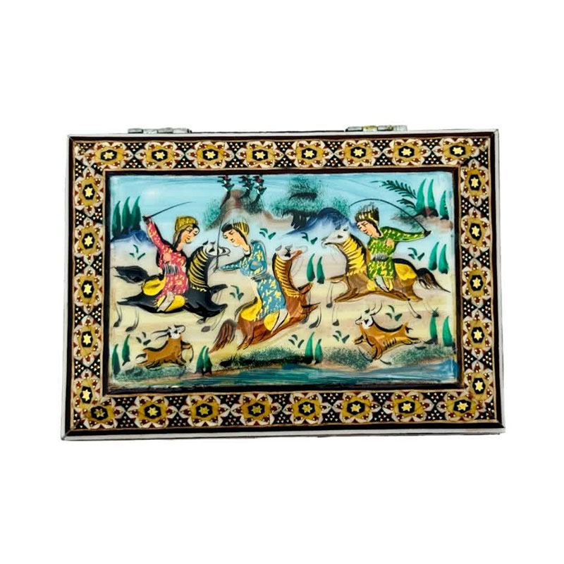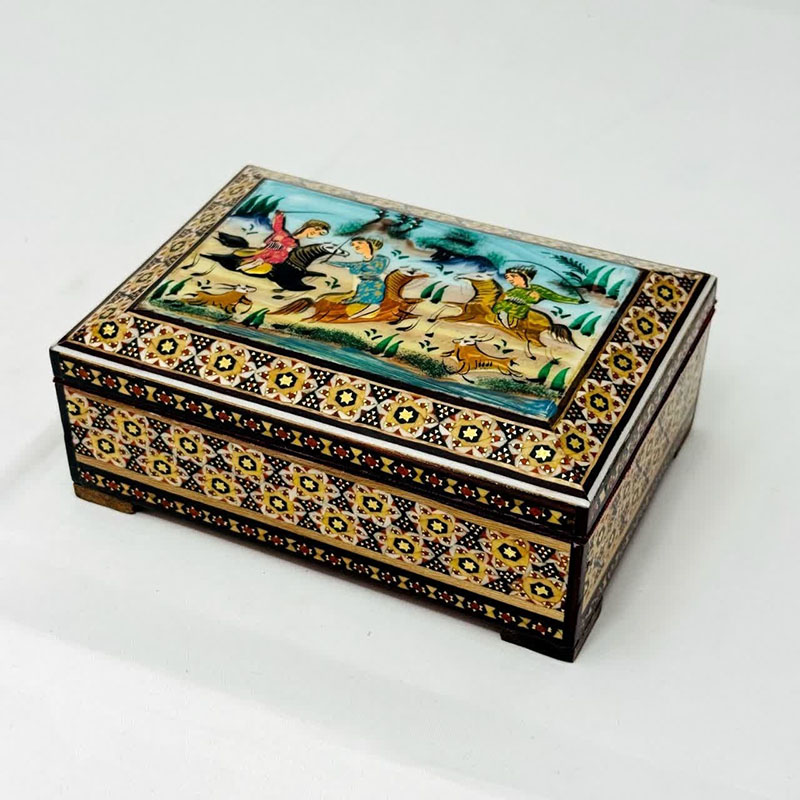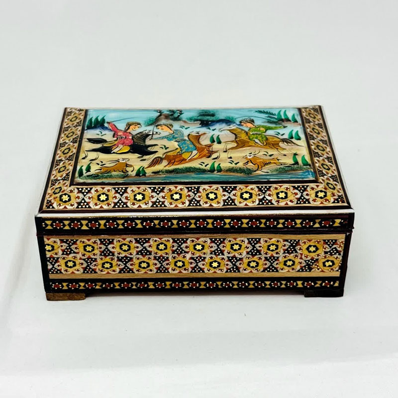 محصول بسیار زیبا و با کیفیت کاردست هنرمندان اصفهانی بسیار مناسب جهت دادن هدیه در داخل آن،مناسب جهت جاجواهراتی و……درب لولایی و داخل مخمل کارشده