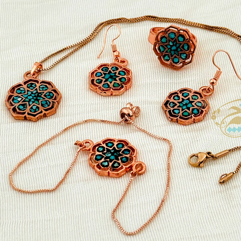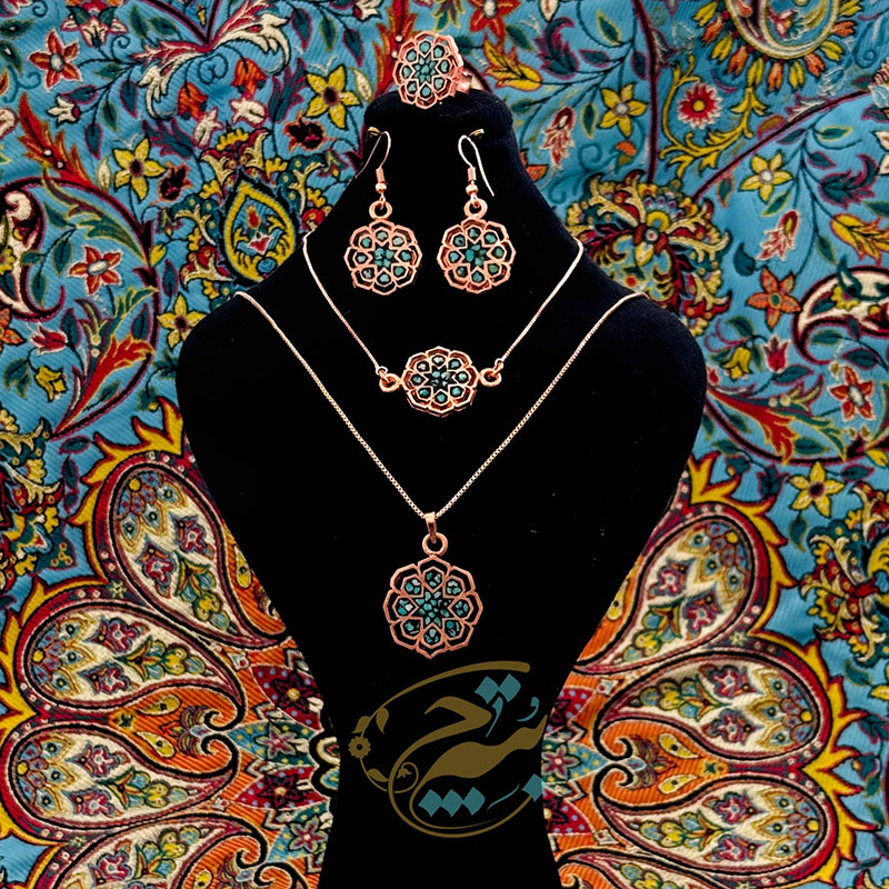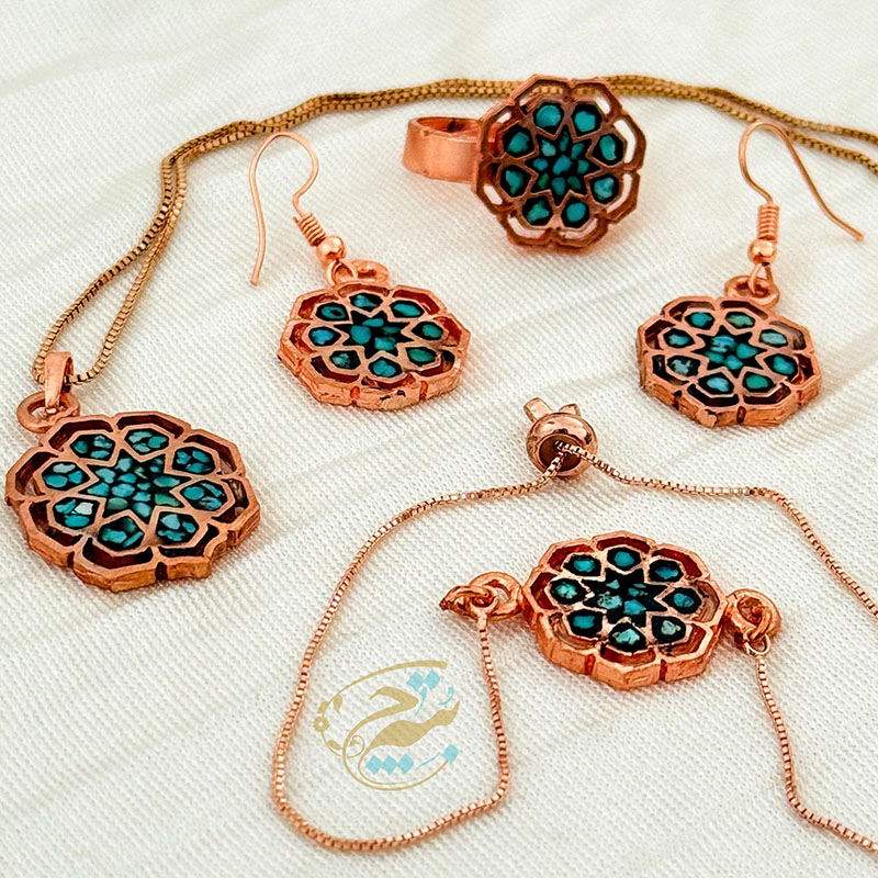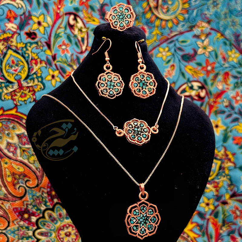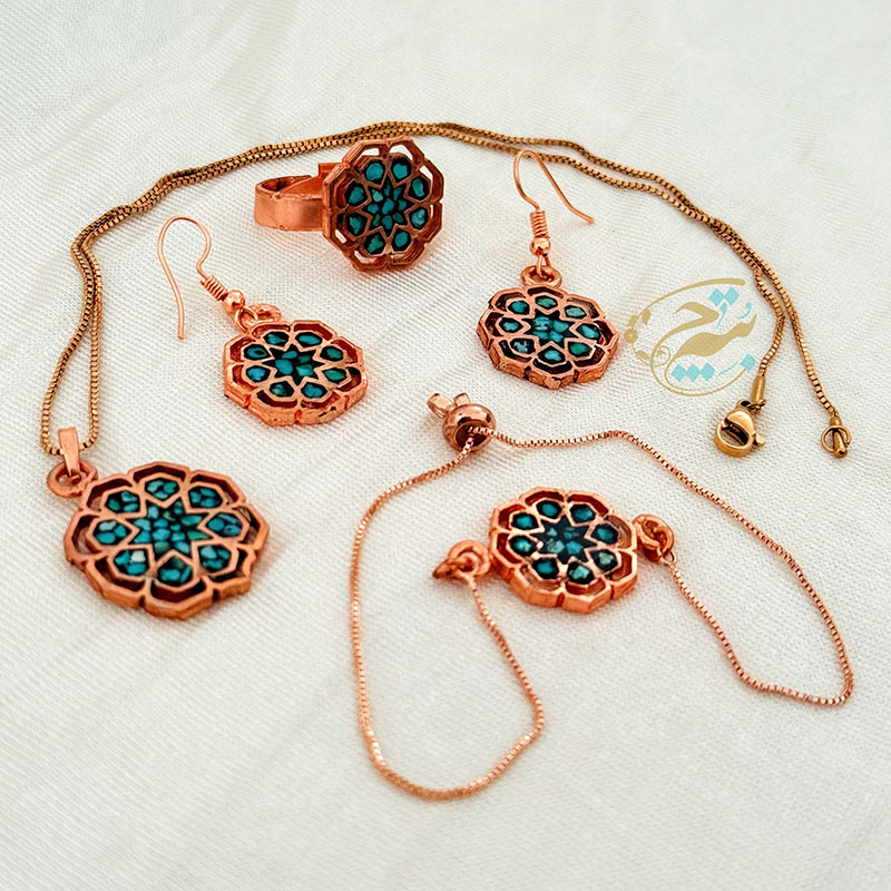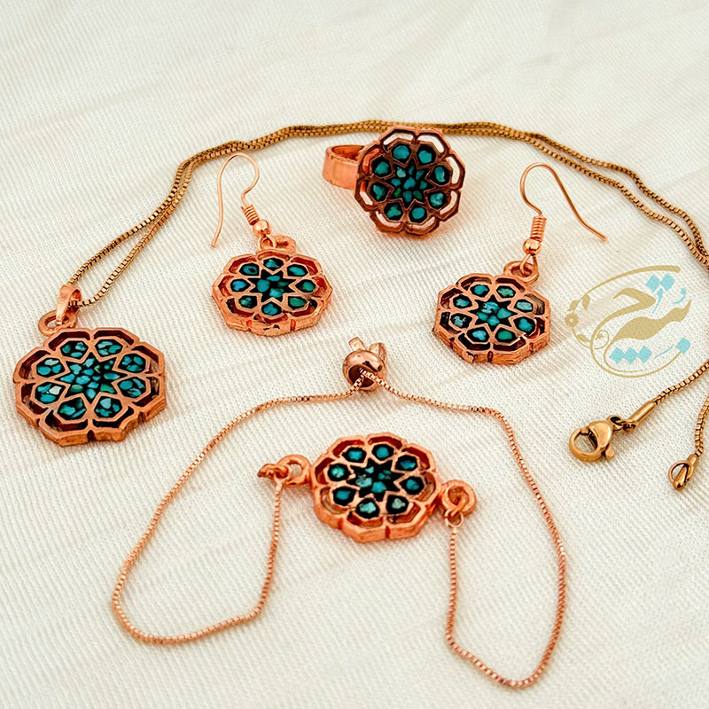 ست زیورآلات مسی فیروزه کوبی مدل 10 نمونهای از هنر اصیل ایرانی است که با ظرافت و دقت فراوان تولید شده است.