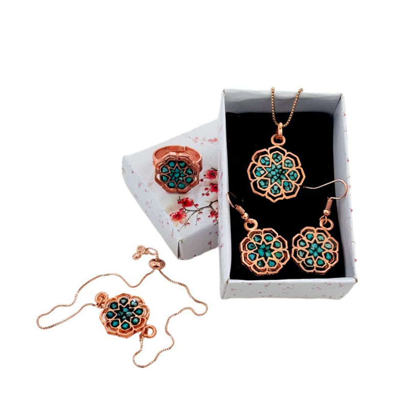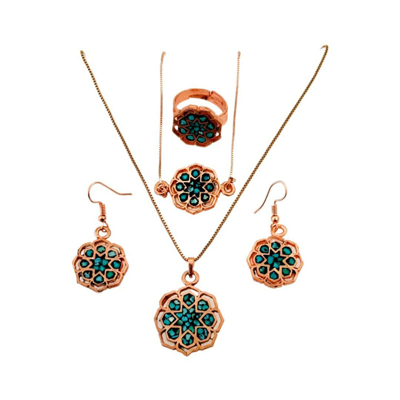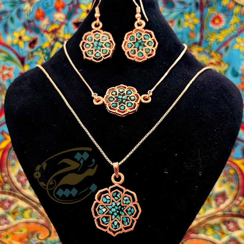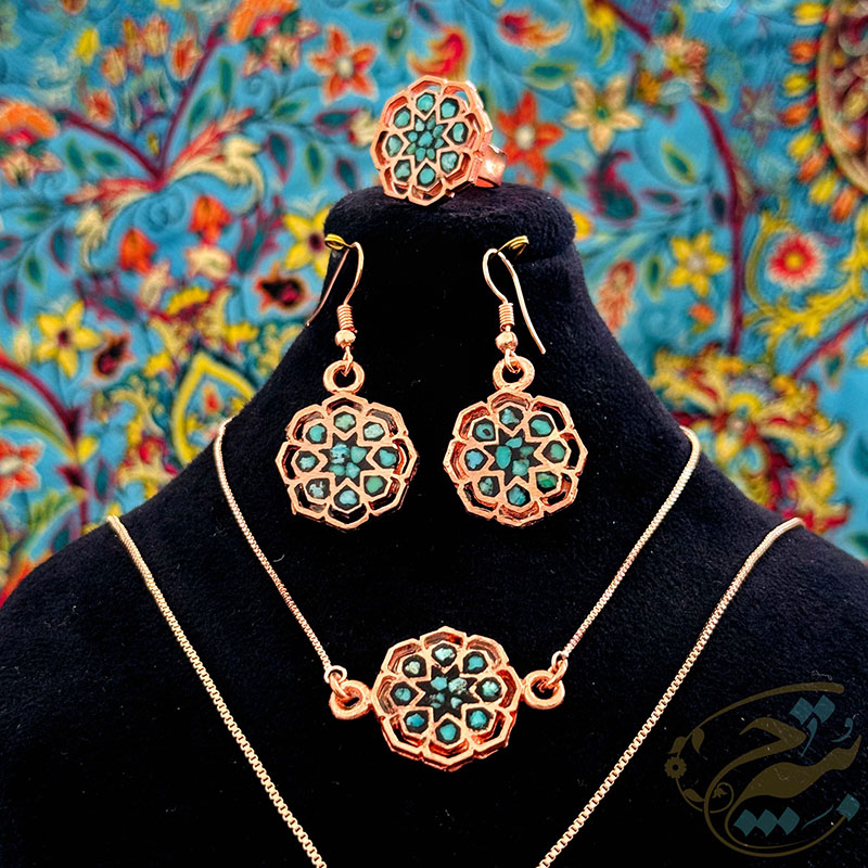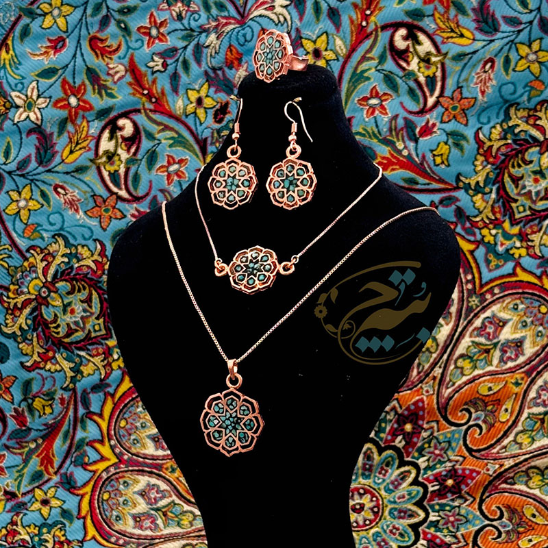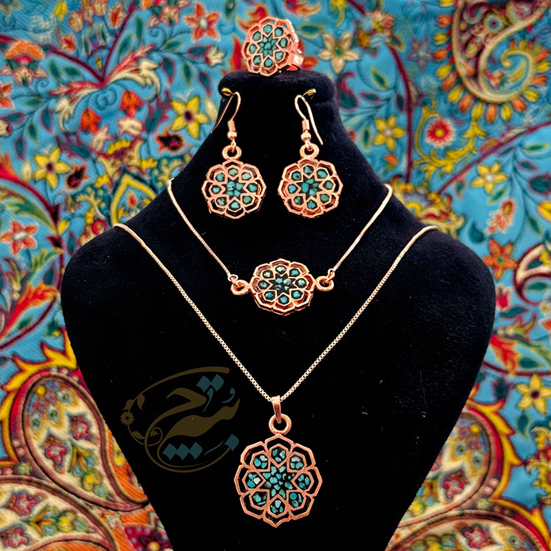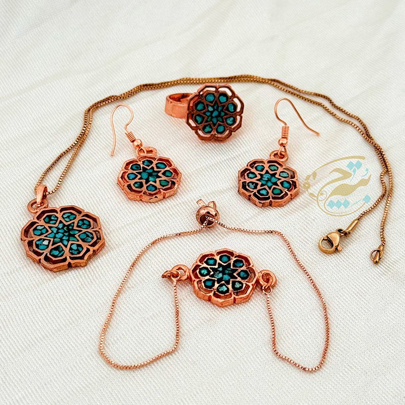 ست زیورآلات مسی فیروزه کوبی مدل 10 نمونهای از هنر اصیل ایرانی است که با ظرافت و دقت فراوان تولید شده است.