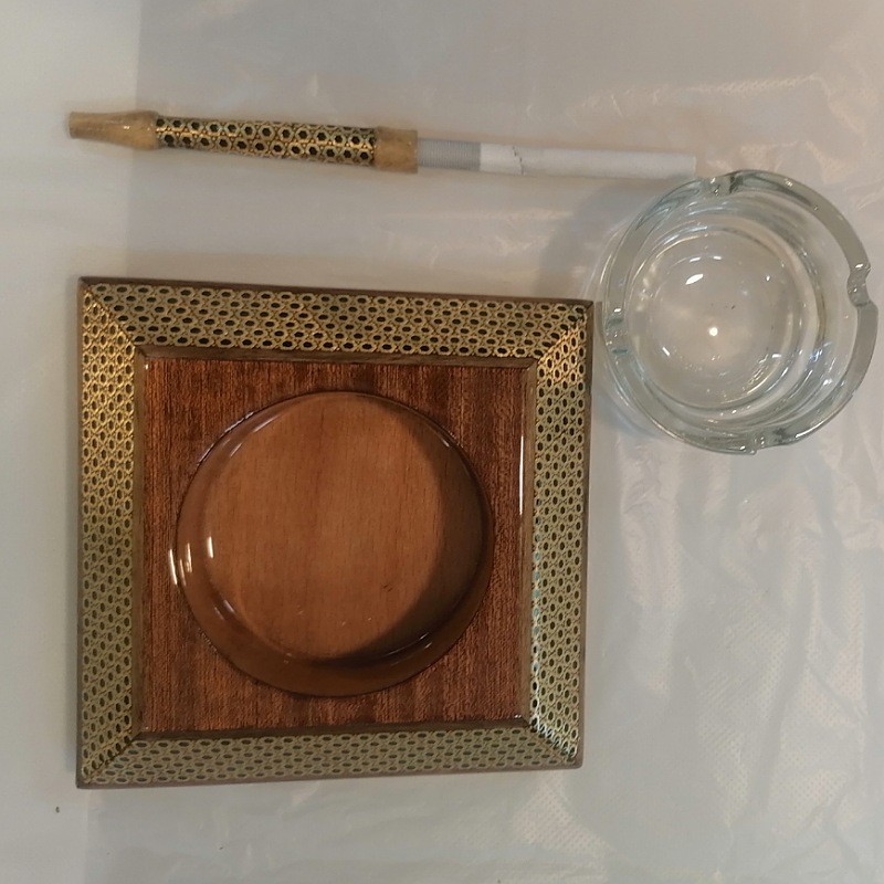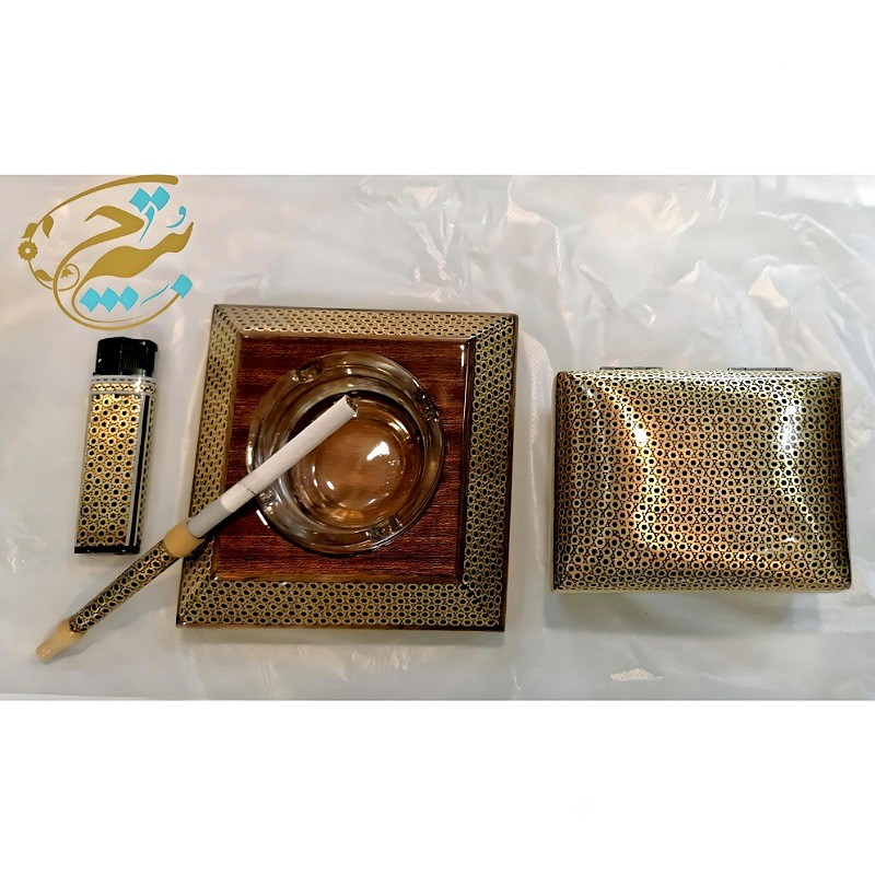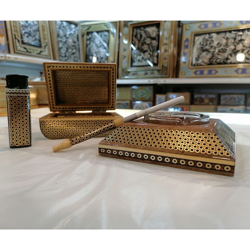 ست هدیه خاتم کاری شامل : 1: فندک خاتم کاری ( 8×2.5×1.5 سانتیمتر) ،نوع سوخت : گاز مايع 2: جعبه تمام خاتم کاری صادراتی به عنوان جاسیگاری :ابعاد کلی4در10در12سانتیمتر و ابعاد داخلی4در8در10 سانتیمتر 3: زیر سیگاری تو شیشه خاتم کاری : ابعاد ۱۲*۱۲*۵ سانتی‌متر همراه یک زیر سیگاری از جنس بلور – دارای ۴ جا سیگاری 4 : چوب سیگار خاتم کاری 8 سانتی متری