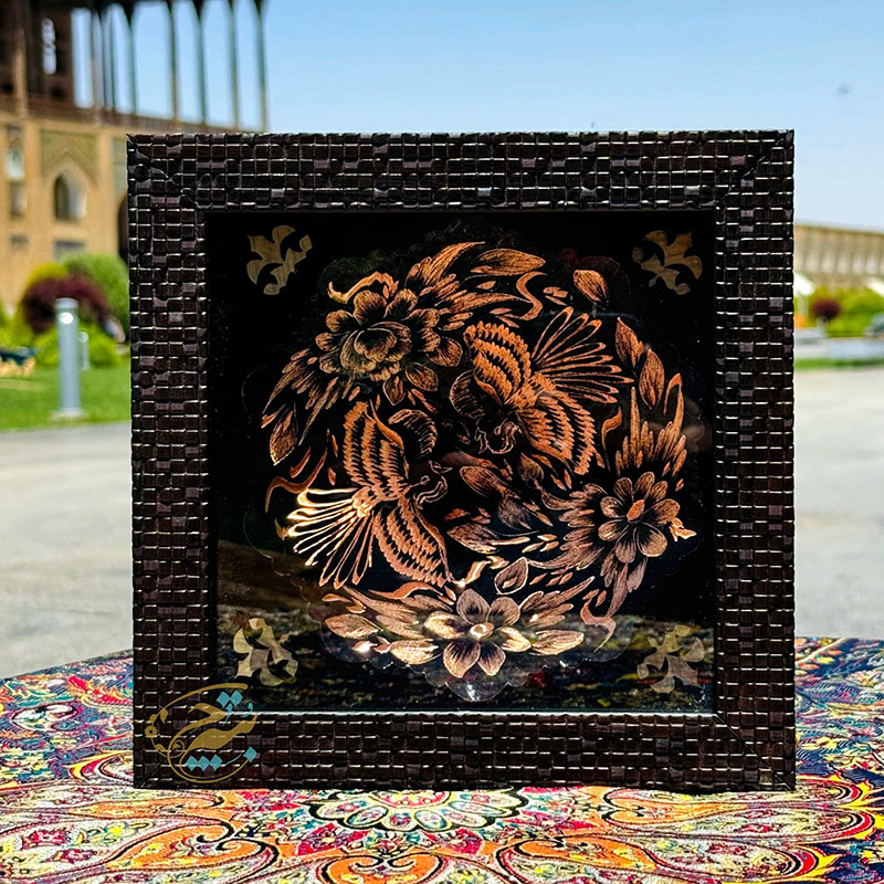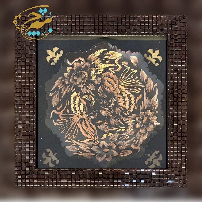 تابلو قلمزنی مسی با قاب خاتم کاری چوگان 42در72