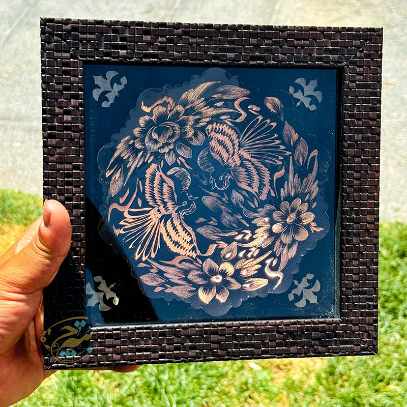 تابلو مسی الماس تراش دارای قطر 16سانتی متری بوده و یک مزیت مهم دارد و آن اینکه این تابلو دارای یک قاب از جنس pvc و در اندازه 24در24سانتی متر میباشد که ار طرفی استفاده و حمل و نقل این تابلو را راحت تر کرده است و از طرفی دیگر به نوعی یک محافظ مهم در برابر گرد و غبار و خطرات دیگر است. طراحی و رنگ آمیزی این تابلو نیز در نوع خود دیدنی و شگفت انگیز است. برای رنگ آمیزی این تابلو از رنگ آبی استفاده شده است. لبه های این تابلو همانگونه که در تصویر نیز مشاهده میکنید دارای دالبری های کوچک است که به زیبایی بیشتر این تابلو کمک بسیاری کرده است و در قسمت مرکزی این تابلو سه عدد سیمرغ تعبیه شده که به زیبایی بیشتر این محصول کمک بسزایی نموده است. ترکیب خلاقانه رنگ مشکی به همراه رنگ سرخ فلز مس بر روی این تابلو مسی به کار رفته سبب شده تا این محصول دارای جذابیتی خاص و چشم نواز برای هر بیننده ای باشد.