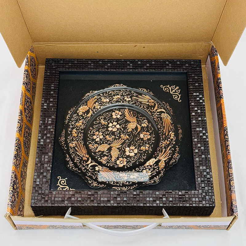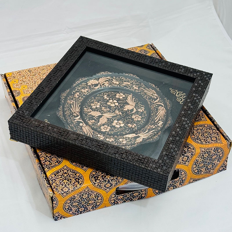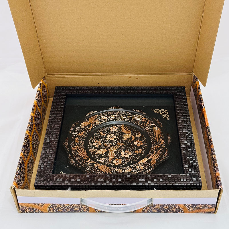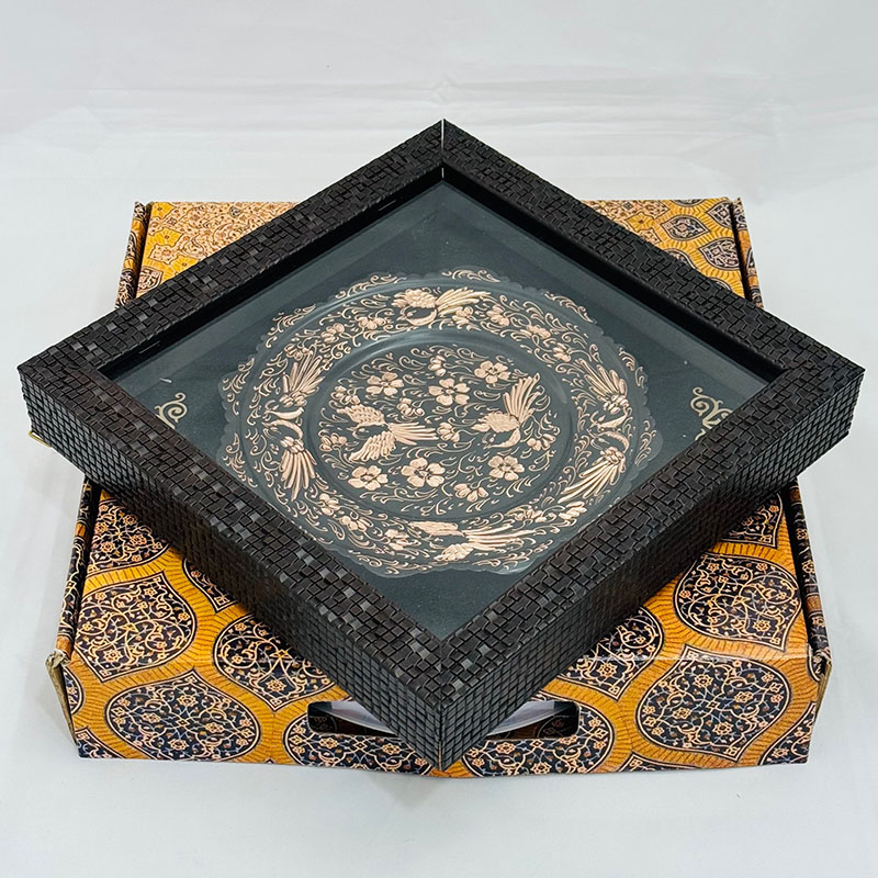 تابلو مسی الماس تراش دارای قطر 20سانتی متری بوده و یک مزیت مهم دارد و آن اینکه این تابلو دارای یک قاب از جنس pvc و در اندازه 30در30سانتی متر میباشد که ار طرفی استفاده و حمل و نقل این تابلو را راحت تر کرده است و از طرفی دیگر به نوعی یک محافظ مهم در برابر گرد و غبار و خطرات دیگر است. طراحی و رنگ آمیزی این تابلو نیز در نوع خود دیدنی و شگفت انگیز است. برای رنگ آمیزی این تابلو از رنگ آبی استفاده شده است. لبه های این تابلو همانگونه که در تصویر نیز مشاهده میکنید دارای دالبری های کوچک است که به زیبایی بیشتر این تابلو کمک بسیاری کرده است و در قسمت مرکزی این تابلو سه عدد سیمرغ تعبیه شده که به زیبایی بیشتر این محصول کمک بسزایی نموده است. ترکیب خلاقانه رنگ مشکی به همراه رنگ سرخ فلز مس بر روی این تابلو مسی به کار رفته سبب شده تا این محصول دارای جذابیتی خاص و چشم نواز برای هر بیننده ای باشد.