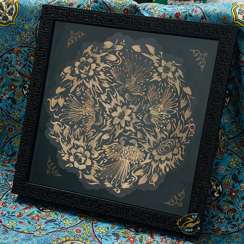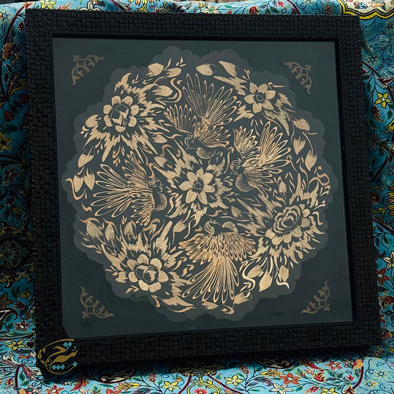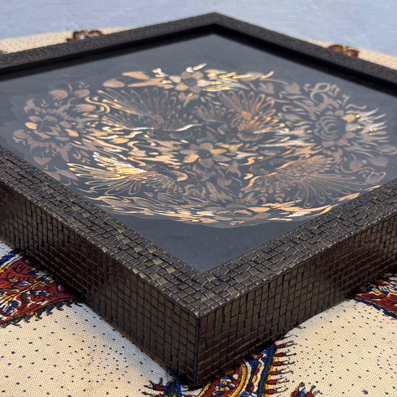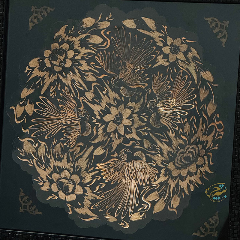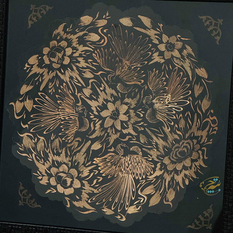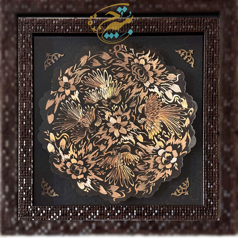تابلو مسی الماس تراش دارای قطر 30سانتی متری بوده و یک مزیت مهم دارد و آن اینکه این تابلو دارای یک قاب از جنس pvc و در اندازه 36در36 سانتی متر میباشد که ار طرفی استفاده و حمل و نقل این تابلو را راحت تر کرده است و از طرفی دیگر به نوعی یک محافظ مهم در برابر گرد و غبار و خطرات دیگر است. طراحی و رنگ آمیزی این تابلو نیز در نوع خود دیدنی و شگفت انگیز است. برای رنگ آمیزی این تابلو از رنگ آبی استفاده شده است. لبه های این تابلو همانگونه که در تصویر نیز مشاهده میکنید دارای دالبری های کوچک است که به زیبایی بیشتر این تابلو کمک بسیاری کرده است و در قسمت مرکزی این تابلو یک گل شش پر کوچک و چهار سیمرغ تعبیه شده که به زیبایی بیشتر این محصول کمک بسزایی نموده است. ترکیب خلاقانه رنگ مشکی به همراه رنگ سرخ فلز مس بر روی این تابلو مسی به کار رفته سبب شده تا این محصول دارای جذابیتی خاص و چشم نواز برای هر بیننده ای باشد.