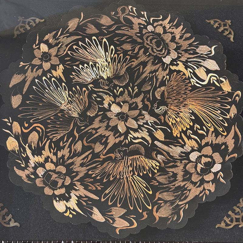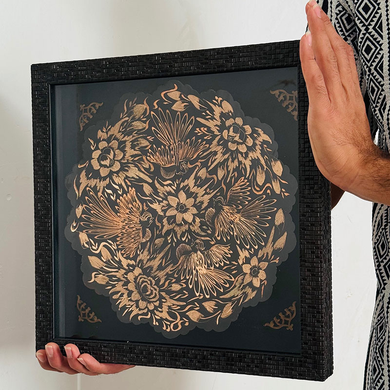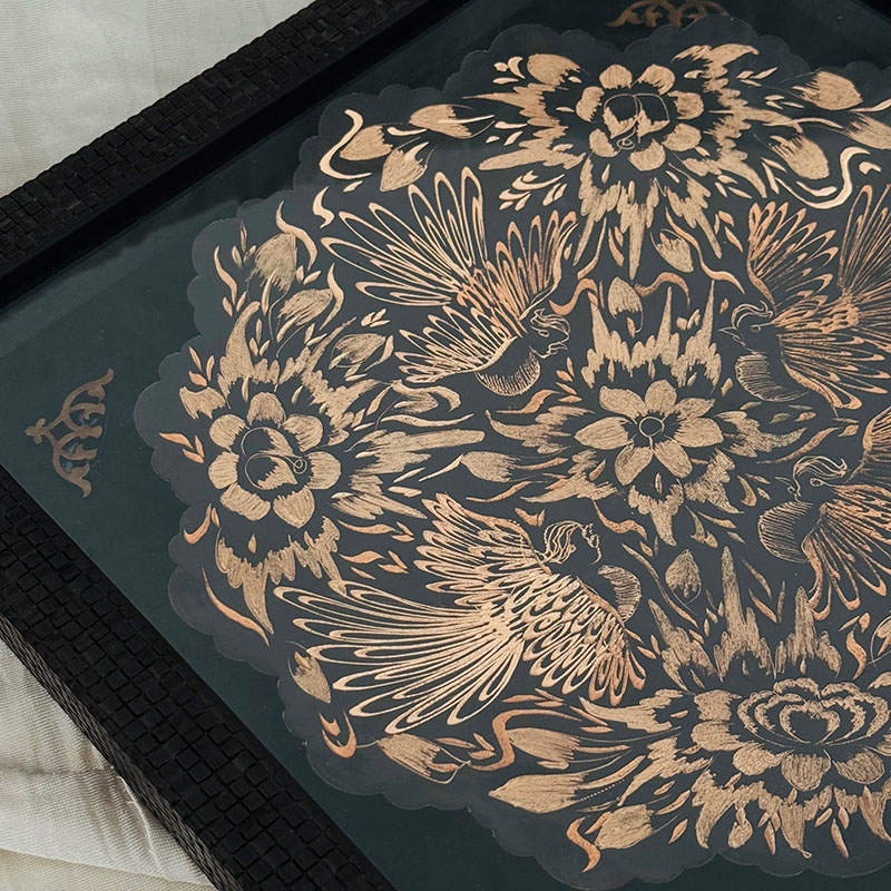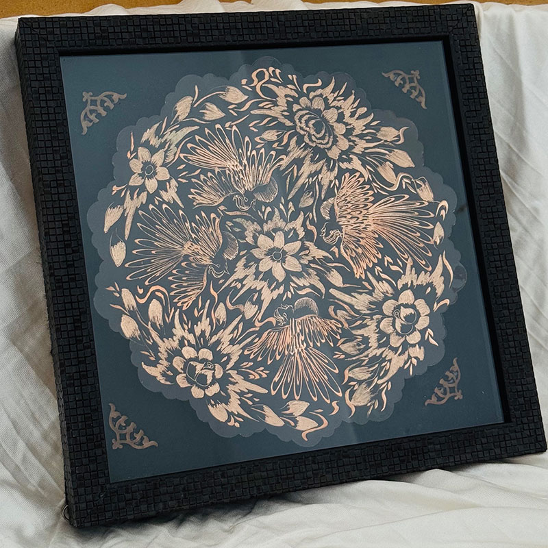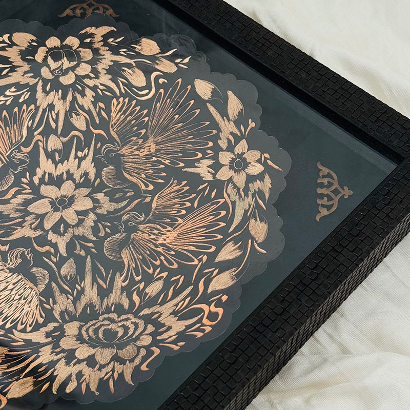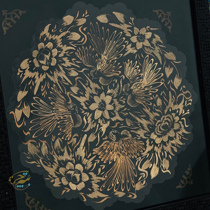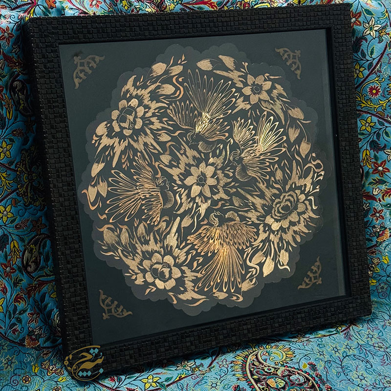 تابلو مسی الماس تراش دارای قطر 30سانتی متری بوده و یک مزیت مهم دارد و آن اینکه این تابلو دارای یک قاب از جنس pvc و در اندازه 36در36 سانتی متر میباشد که ار طرفی استفاده و حمل و نقل این تابلو را راحت تر کرده است و از طرفی دیگر به نوعی یک محافظ مهم در برابر گرد و غبار و خطرات دیگر است. طراحی و رنگ آمیزی این تابلو نیز در نوع خود دیدنی و شگفت انگیز است. برای رنگ آمیزی این تابلو از رنگ آبی استفاده شده است. لبه های این تابلو همانگونه که در تصویر نیز مشاهده میکنید دارای دالبری های کوچک است که به زیبایی بیشتر این تابلو کمک بسیاری کرده است و در قسمت مرکزی این تابلو یک گل شش پر کوچک و چهار سیمرغ تعبیه شده که به زیبایی بیشتر این محصول کمک بسزایی نموده است. ترکیب خلاقانه رنگ مشکی به همراه رنگ سرخ فلز مس بر روی این تابلو مسی به کار رفته سبب شده تا این محصول دارای جذابیتی خاص و چشم نواز برای هر بیننده ای باشد.