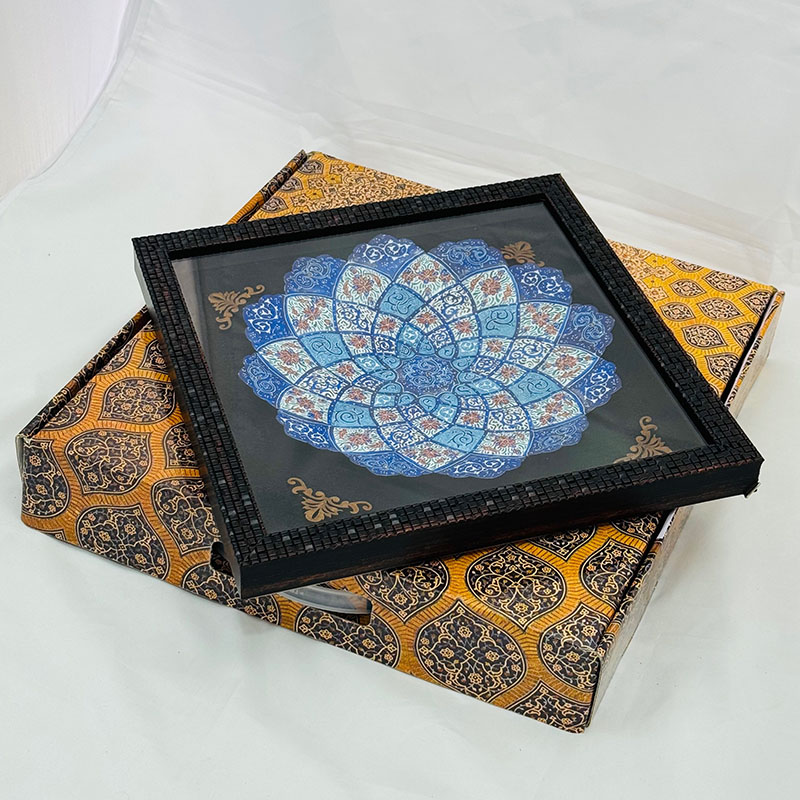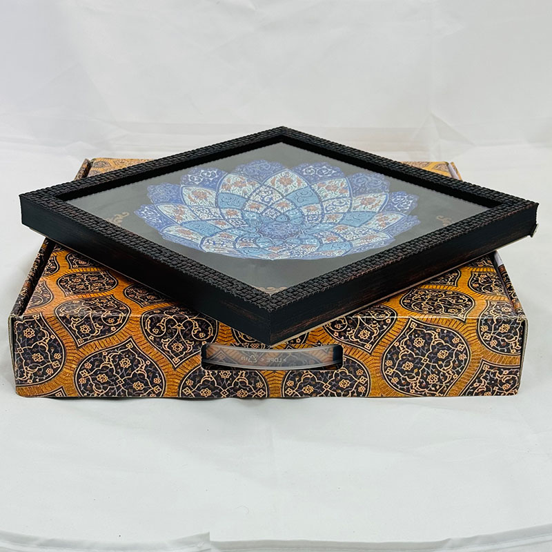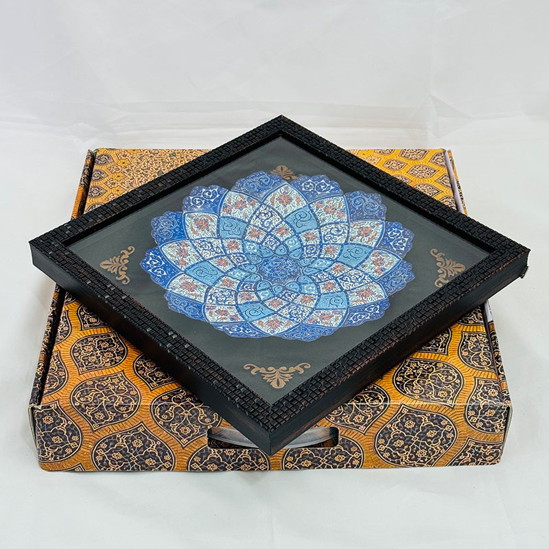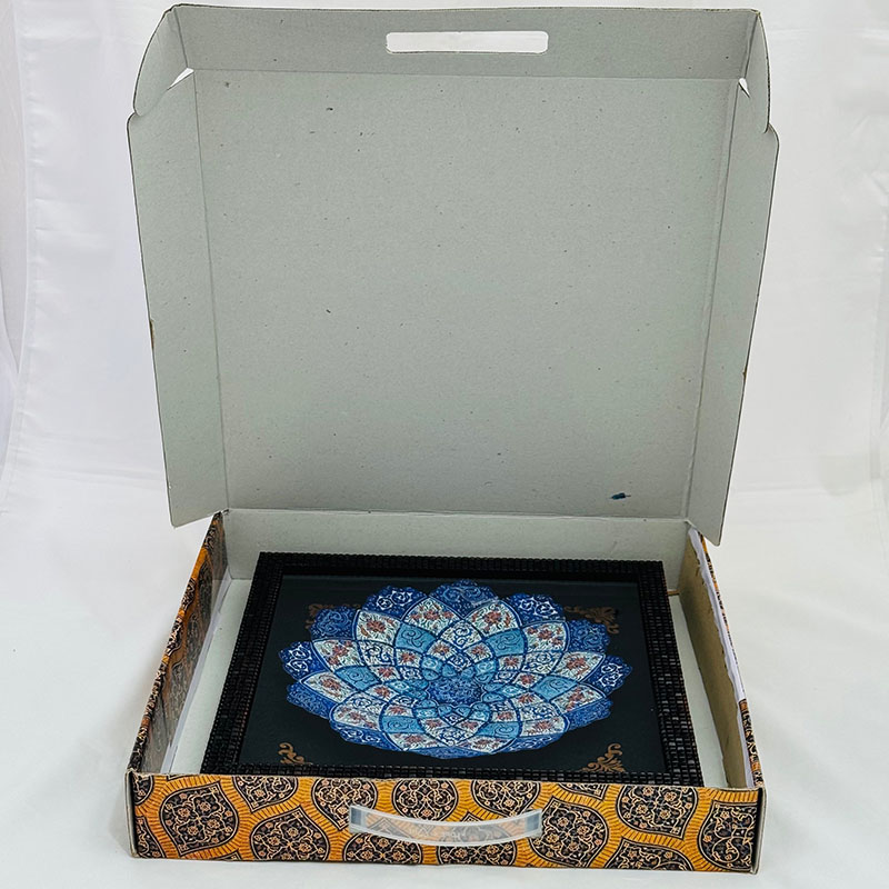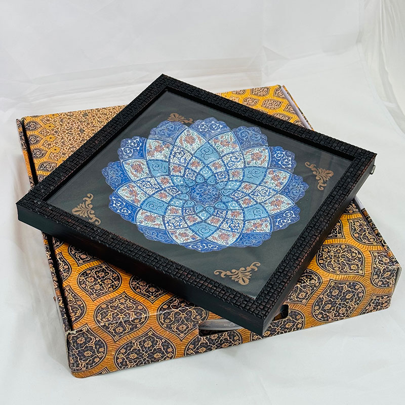 ابعاد 33.5 × 33.5 × 2.5 سانتیمتر طرح میناکاری اسلیمی و خطایی جنس قاب PVC, مس میناکاری شده به همراه جعبه سنتی