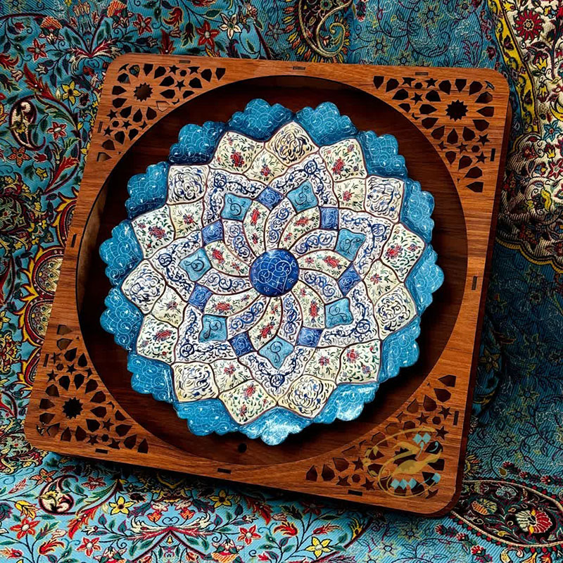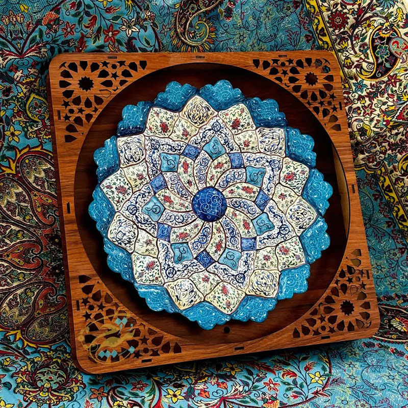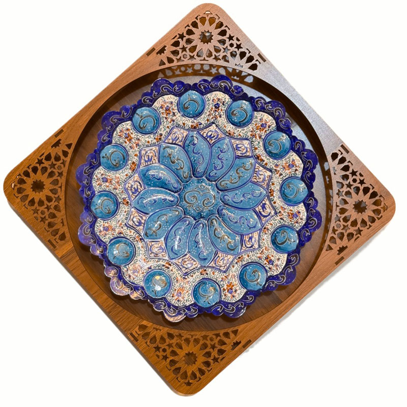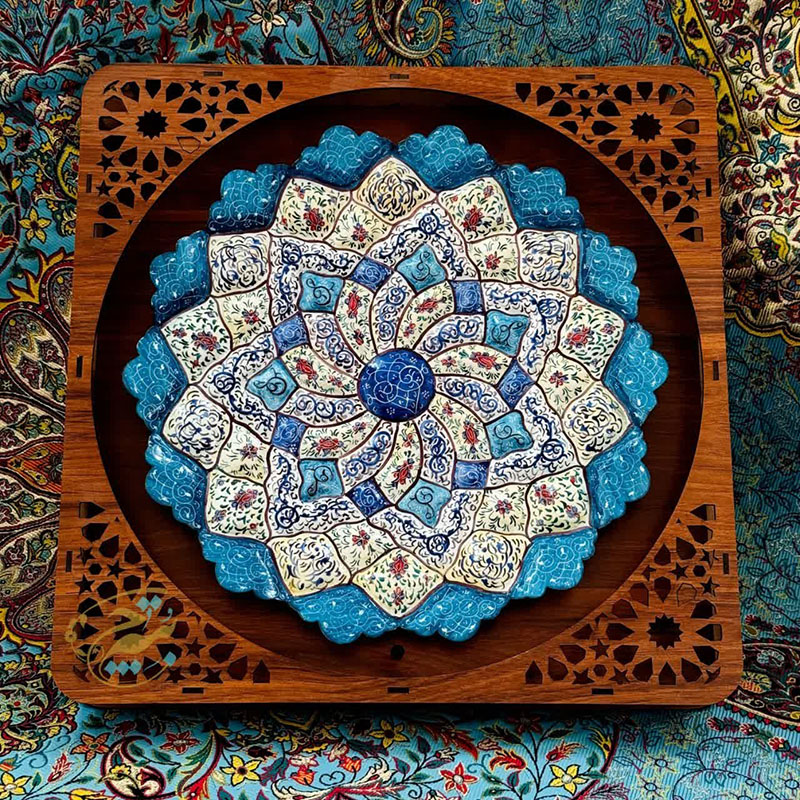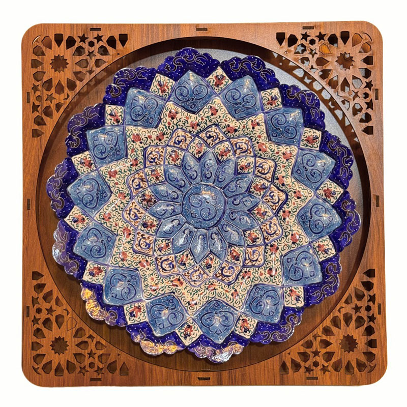 ابعاد کلی 40 سانتی متر قطر بشقاب 30 سانتی متر جنس قاب ازMDF که بابرش لیزری به صورت مشبک طراحی شده و بشقاب ازمس می باشد. آماده ی همکاری باسازمان هاوارگان های دولتی خصوصی و…