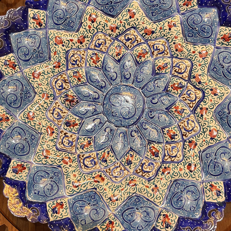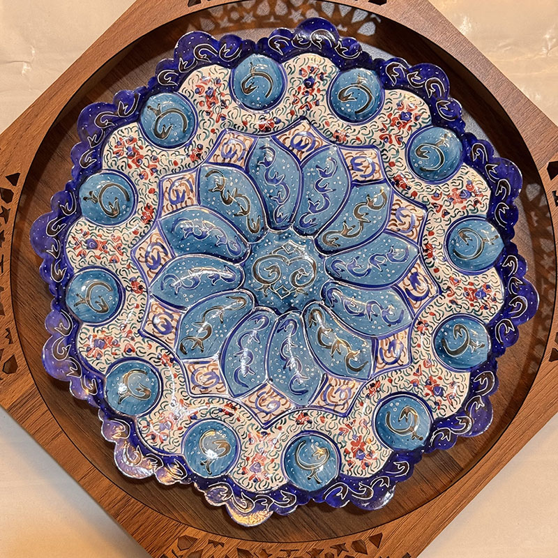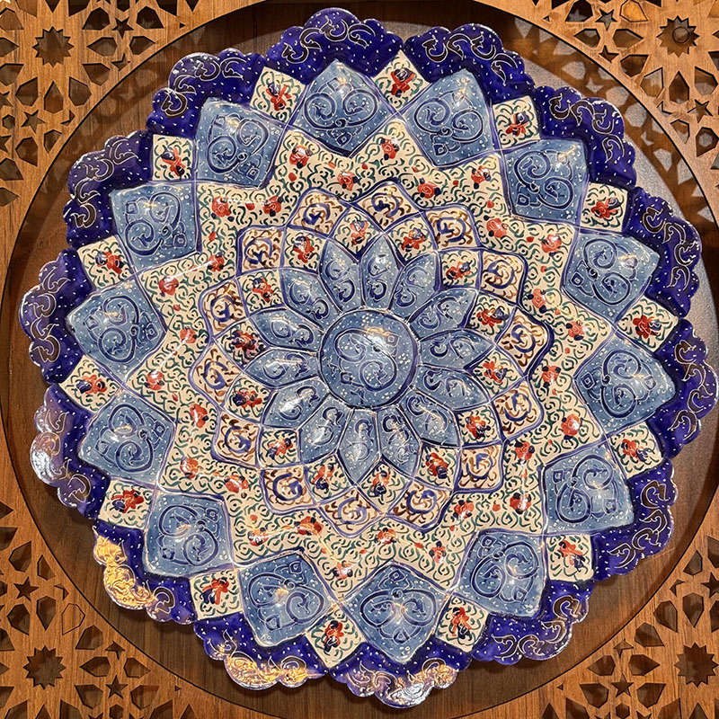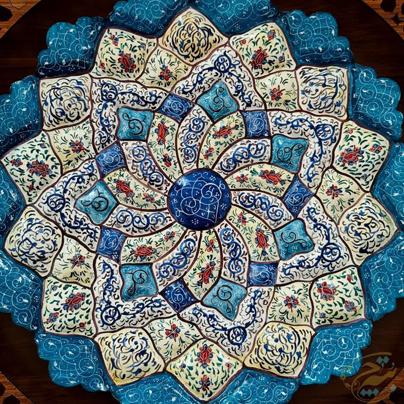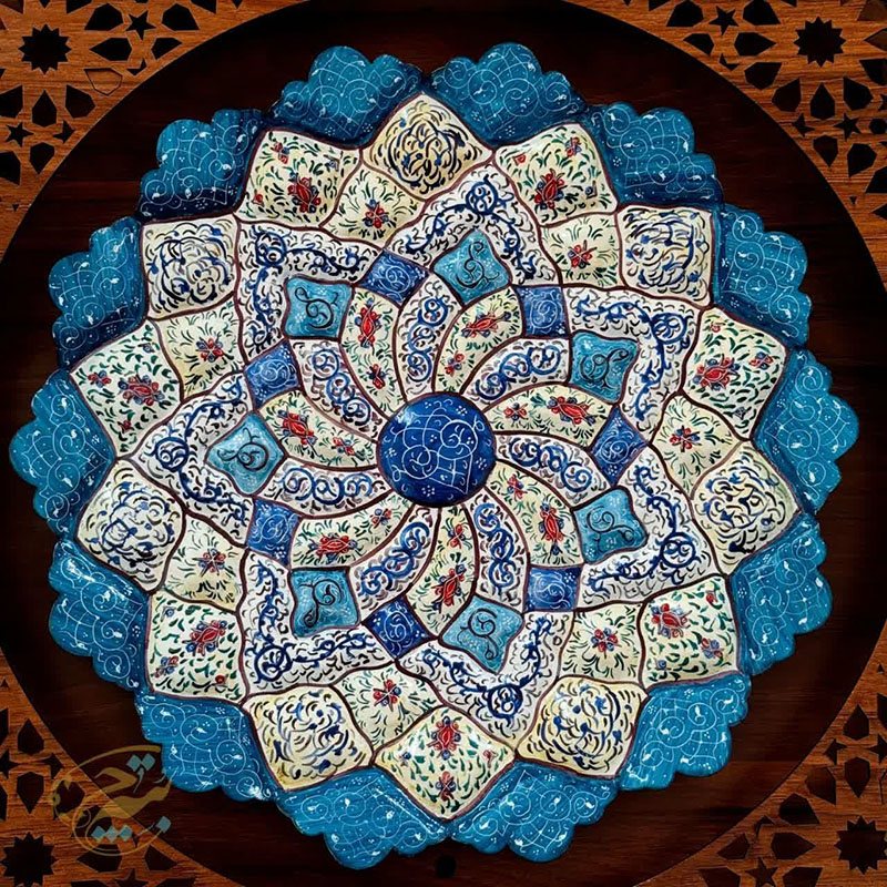ابعاد کلی 40 سانتی متر قطر بشقاب 30 سانتی متر جنس قاب ازMDF که بابرش لیزری به صورت مشبک طراحی شده و بشقاب ازمس می باشد. آماده ی همکاری باسازمان هاوارگان های دولتی خصوصی و…