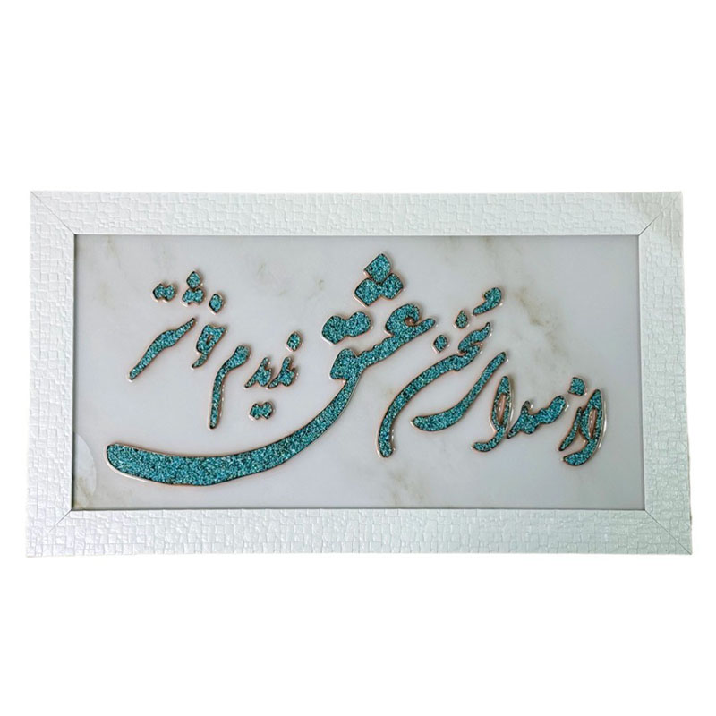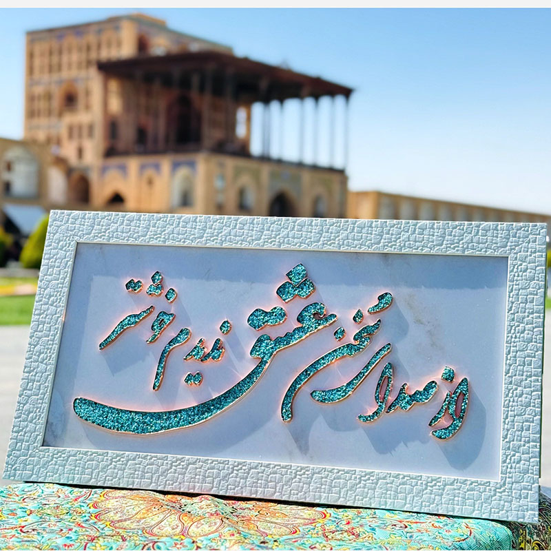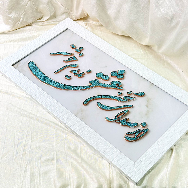 در این تابلوهای زیبا ،متن به صورت برجسته مسی طراحی شده و بر روی آن با خرده سنگ های فیروزه نیشابور تزیین شده،همچنین پس زمینه تابلو با رزین شفاف درخشان شده و از کیفیت و زیبایی خاصی برخوردار هست. ابعاد تابلو فیروزه کوبی 38در68 وابعاد داخلی 30در60 سانتیمتر است و در پشت قاب، گیره آویز برای نصب روی دیوار قرار داده شده است. خرده سنگ های فیروزه به کار رفته در این تابلوی زیبا،فیروزه نیشابور است که توسط دست جایگذاری و چسبانده شدهاند. هنر فیروزه کوبی جزء صنایع دستی اصفهان است و با نشاندن قطعه های کوچک سنگ فیروزه به حالت موزاییکی بر سطح ظروف،تابلو ، زیورآلات و اشیای تزئینی ساخته می شود .