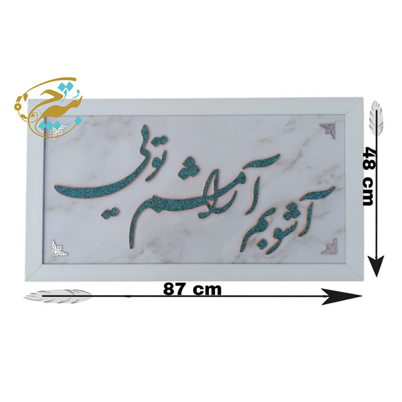 در این تابلوهای زیبا ،متن به صورت برجسته مسی طراحی شده و بر روی آن با خرده سنگ های فیروزه نیشابور تزیین شده،همچنین پس زمینه تابلو با رزین شفاف درخشان شده و از کیفیت و زیبایی خاصی برخوردار هست. ابعاد تابلو فیروزه کوبی 48در87 سانتیمتر است و در پشت قاب، گیره آویز برای نصب روی دیوار قرار داده شده است. خرده سنگ های فیروزه به کار رفته در این تابلوی زیبا،فیروزه نیشابور است که توسط دست جایگذاری و چسبانده شدهاند. هنر فیروزه کوبی جزء صنایع دستی اصفهان است و با نشاندن قطعه های کوچک سنگ فیروزه به حالت موزاییکی بر سطح ظروف،تابلو ، زیورآلات و اشیای تزئینی ساخته می شود .