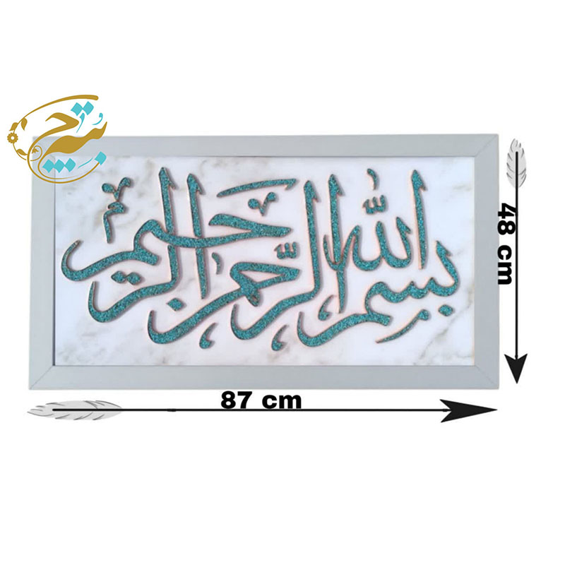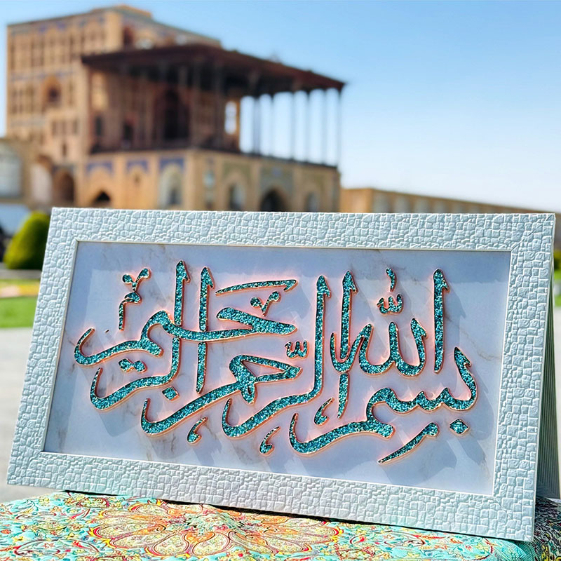 در این تابلوهای زیبا ،متن به صورت برجسته مسی طراحی شده و بر روی آن با خرده سنگ های فیروزه نیشابور تزیین شده،همچنین پس زمینه تابلو با رزین شفاف درخشان شده و از کیفیت و زیبایی خاصی برخوردار هست. ابعاد تابلو فیروزه کوبی 48در87 سانتیمتر است و در پشت قاب، گیره آویز برای نصب روی دیوار قرار داده شده است. خرده سنگ های فیروزه به کار رفته در این تابلوی زیبا،فیروزه نیشابور است که توسط دست جایگذاری و چسبانده شدهاند. هنر فیروزه کوبی جزء صنایع دستی اصفهان است و با نشاندن قطعه های کوچک سنگ فیروزه به حالت موزاییکی بر سطح ظروف،تابلو ، زیورآلات و اشیای تزئینی ساخته می شود .