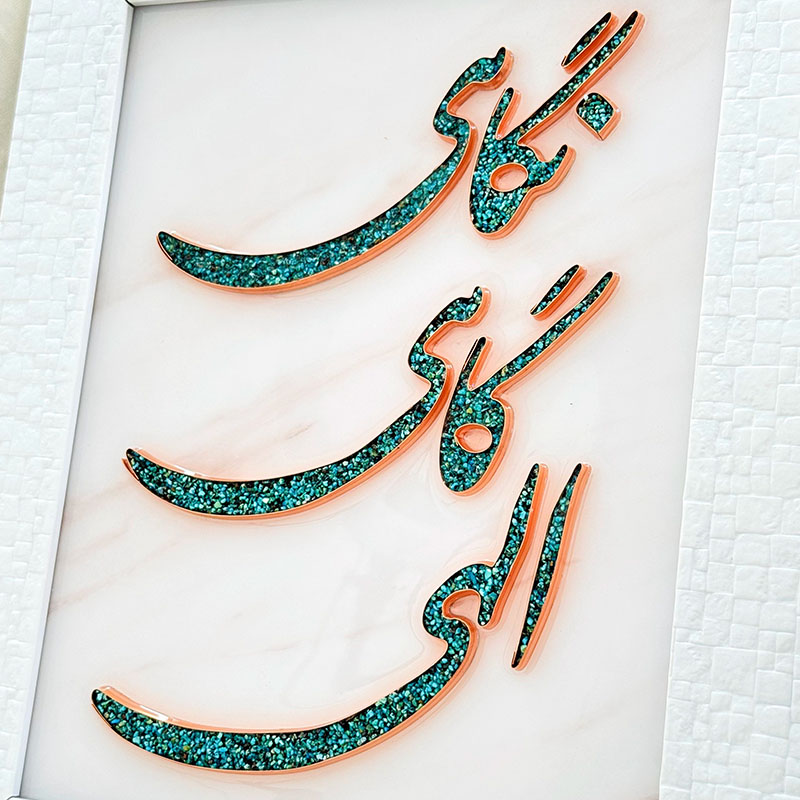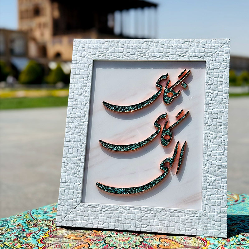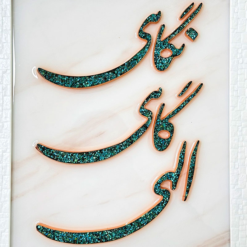قالب کلمات ساخته شده از مس میباشد ، این قابها نقش برجسته هستند و ترکیبی از مس- سنگ اصل فیروزه نیشابور و رزین می باشد.