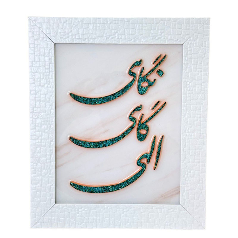 در این تابلوهای زیبا ،متن به صورت برجسته مسی طراحی شده و بر روی آن با خرده سنگ های فیروزه نیشابور تزیین شده،همچنین پس زمینه تابلو با رزین شفاف درخشان شده و از کیفیت و زیبایی خاصی برخوردار هست. ابعاد تابلو فیروزه کوبی 28در38 سانتیمتر است و در پشت قاب، گیره آویز برای نصب روی دیوار قرار داده شده است. خرده سنگ های فیروزه به کار رفته در این تابلوی زیبا،فیروزه نیشابور است که توسط دست جایگذاری و چسبانده شدهاند. هنر فیروزه کوبی جزء صنایع دستی اصفهان است و با نشاندن قطعه های کوچک سنگ فیروزه به حالت موزاییکی بر سطح ظروف،تابلو ، زیورآلات و اشیای تزئینی ساخته می شود .