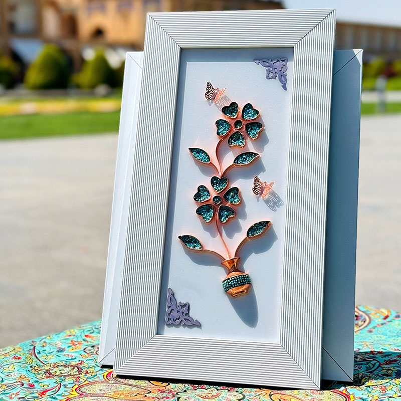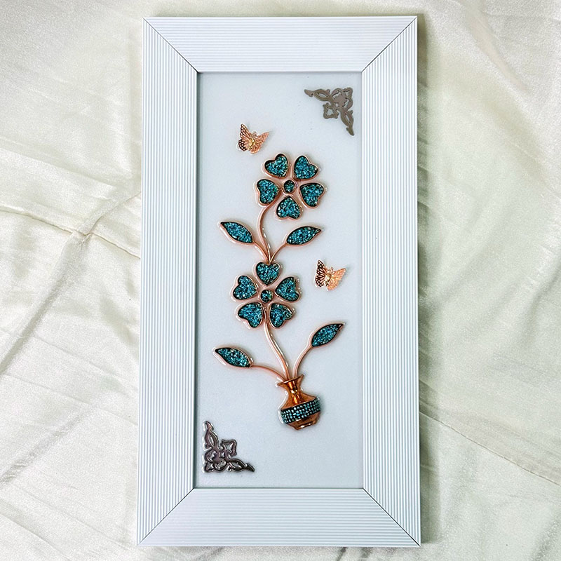 در این تابلوهای زیبا ،متن به صورت برجسته مسی طراحی شده و بر روی آن با خرده سنگ های فیروزه نیشابور تزیین شده،همچنین پس زمینه تابلو با رزین شفاف درخشان شده و از کیفیت و زیبایی خاصی برخوردار هست. ابعاد تابلو فیروزه کوبی 25در45 سانتیمتر است و در پشت قاب، گیره آویز برای نصب روی دیوار قرار داده شده است. خرده سنگ های فیروزه به کار رفته در این تابلوی زیبا،فیروزه نیشابور است که توسط دست جایگذاری و چسبانده شدهاند. هنر فیروزه کوبی جزء صنایع دستی اصفهان است و با نشاندن قطعه های کوچک سنگ فیروزه به حالت موزاییکی بر سطح ظروف،تابلو ، زیورآلات و اشیای تزئینی ساخته می شود .