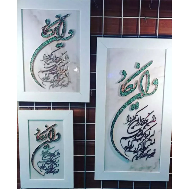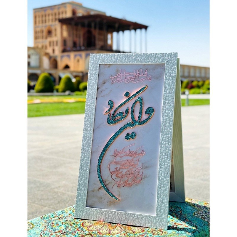 در این تابلوهای زیبا ،متن به صورت برجسته مسی طراحی شده و بر روی آن با خرده سنگ های فیروزه نیشابور تزیین شده،همچنین پس زمینه تابلو با رزین شفاف درخشان شده و از کیفیت و زیبایی خاصی برخوردار هست. ابعاد تابلو فیروزه کوبی 38در68 وابعاد داخلی 30در60 سانتیمتر است و در پشت قاب، گیره آویز برای نصب روی دیوار قرار داده شده است. خرده سنگ های فیروزه به کار رفته در این تابلوی زیبا،فیروزه نیشابور است که توسط دست جایگذاری و چسبانده شدهاند. هنر فیروزه کوبی جزء صنایع دستی اصفهان است و با نشاندن قطعه های کوچک سنگ فیروزه به حالت موزاییکی بر سطح ظروف،تابلو ، زیورآلات و اشیای تزئینی ساخته می شود .