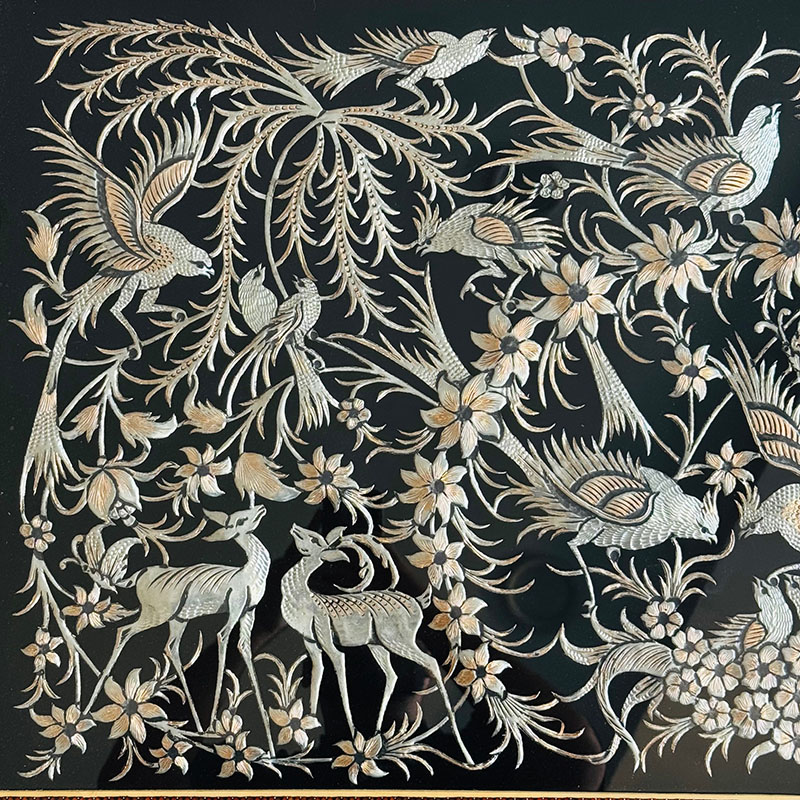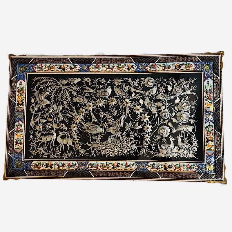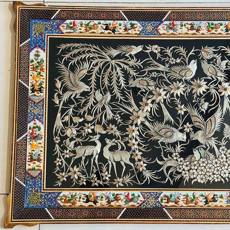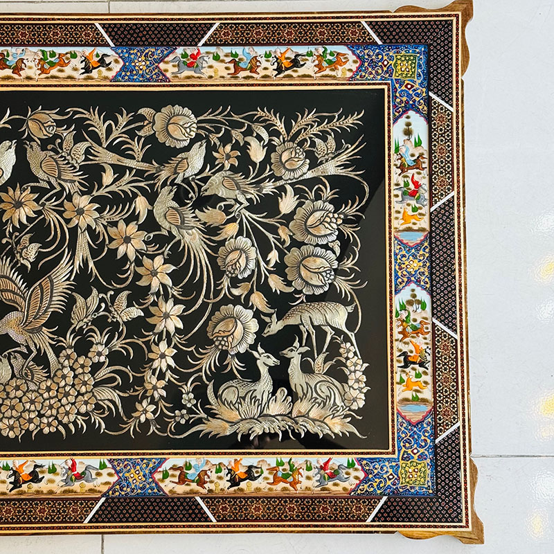 ابعاد این تابلوی زیبا 70در120 سانتی متر و ابعاد داخلی 50 در100 سانت می باشد. تابلو قلمزنی گل و مرغ با قاب خاتم کاری دورنقاشی شکار اثر هنرمندان اصفهان با تلفیق هنرهای قلم زنی ، خاتم کاری می باشد. پلاک داخلی طرح گل و مرغ برجسته بر روی مس می باشد. لطفاً قبل از سفارش طرح مورد نظرتون رو استعلام بگیرید و با اطمینان خرید کنید.