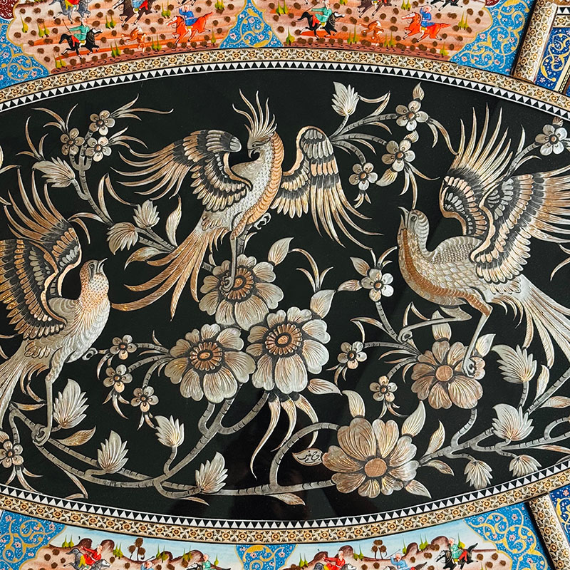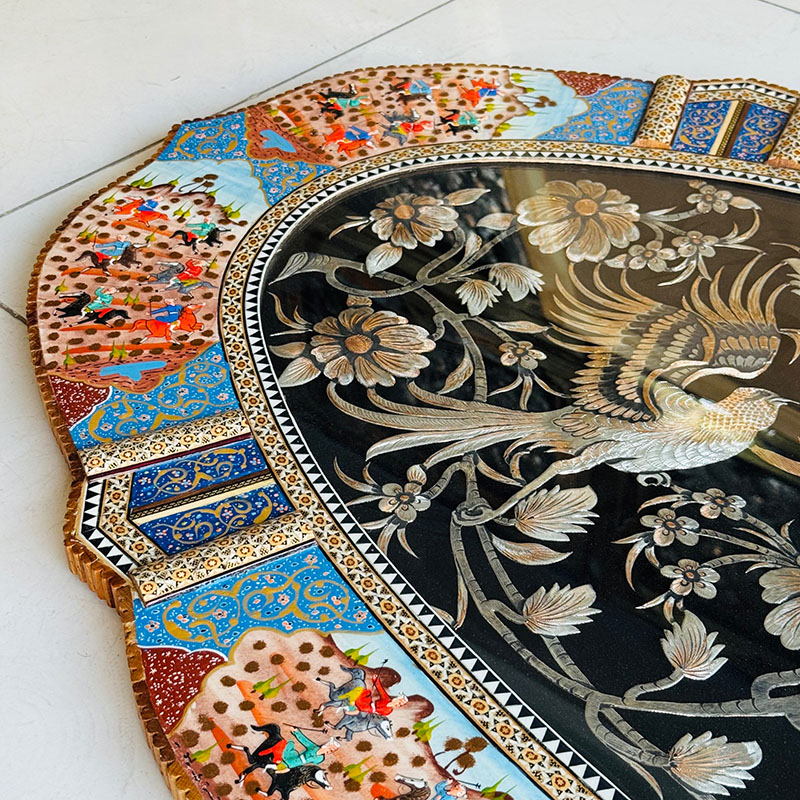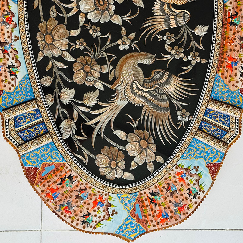 ابعادکلی این تابلوی زیبا 70در120سانتی متر و ابعادی که پلاک مسی در آن قرار میگیرد 50در100 می باشد. تابلو قلمزنی گل و مرغ با قاب خاتم کاری بسیار زیبا و نفیس اثر هنرمندان اصفهان با تلفیق هنرهای قلم زنی ، خاتم کاری پلاک داخلی طرح گل و مرغ برجسته بر روی مس می باشد. لطفاً قبل از سفارش طرح مورد نظرتون رو استعلام بگیرید و با اطمینان خرید کنید.