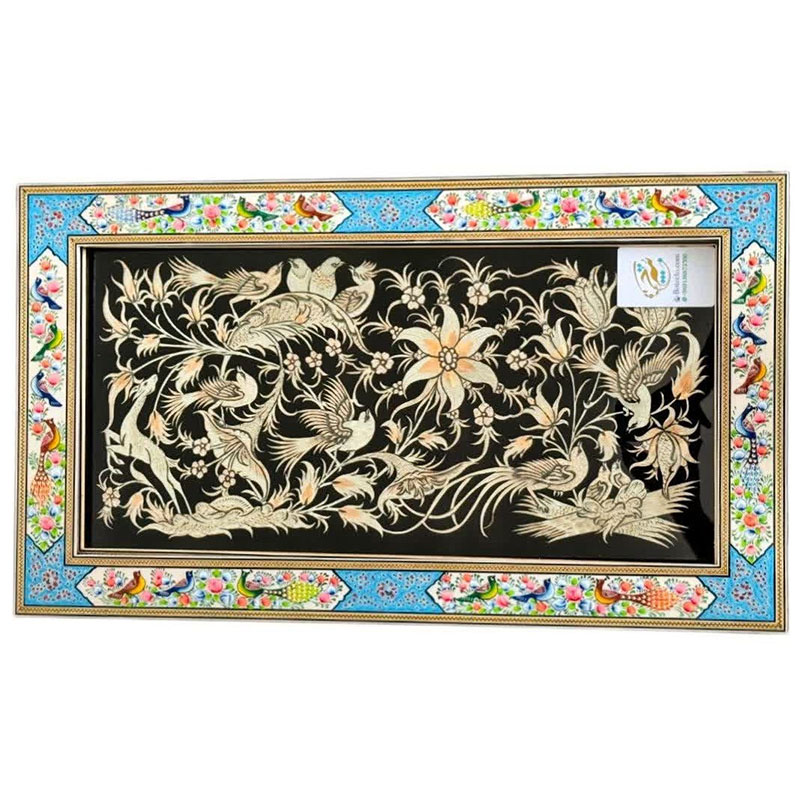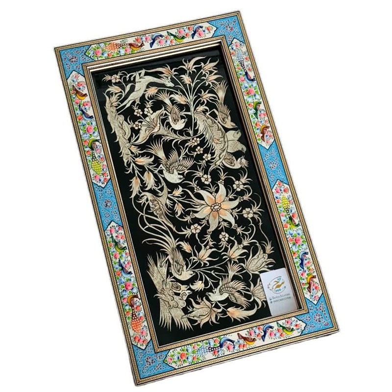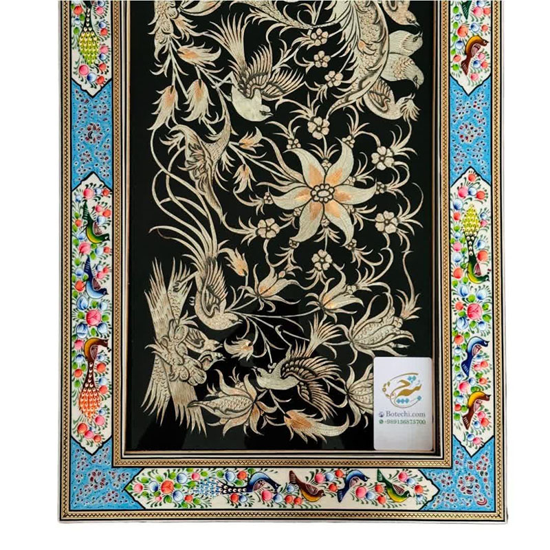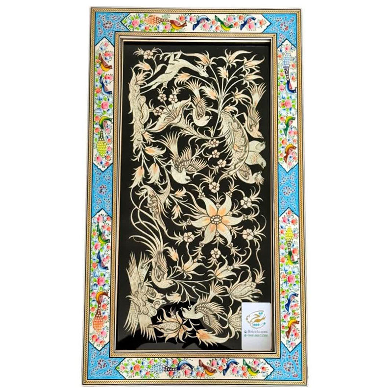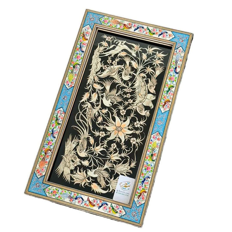 تابلو قلمزنی با قاب خاتم کاری گل و بلبل آبی روشن 42در72