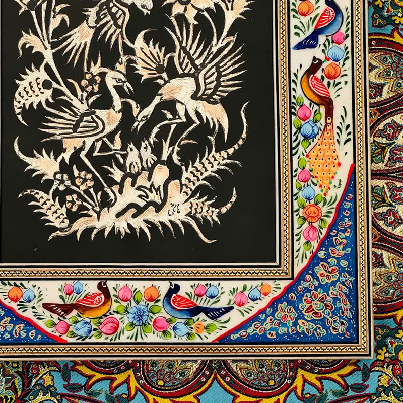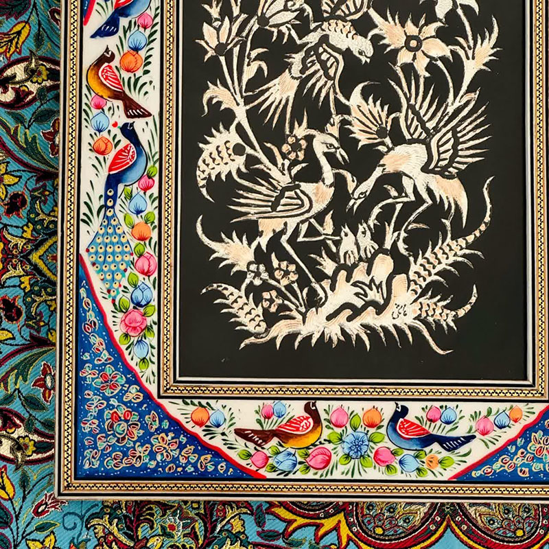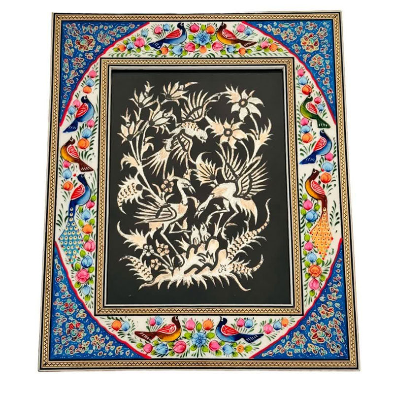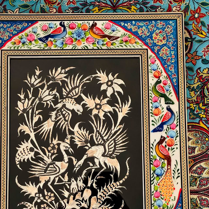 تابلو قلمزنی رومیزی با قاب خاتم کاری گل و بلبل 28در34