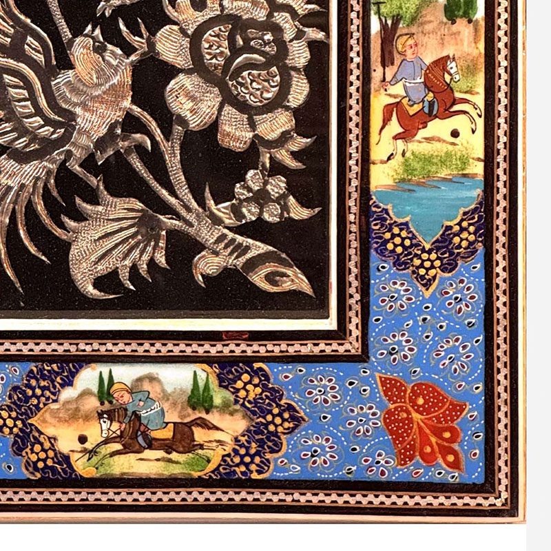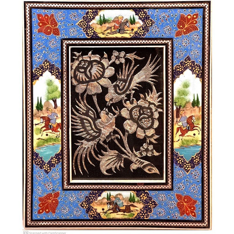 تابلو قلمزنی رومیزی مسی با قاب خاتم کاری چوگان