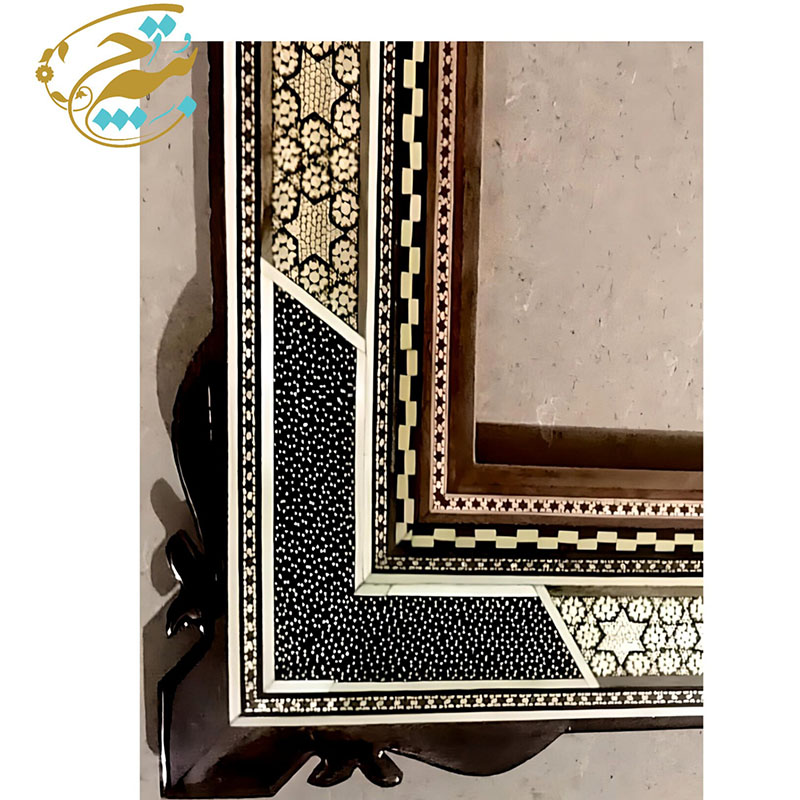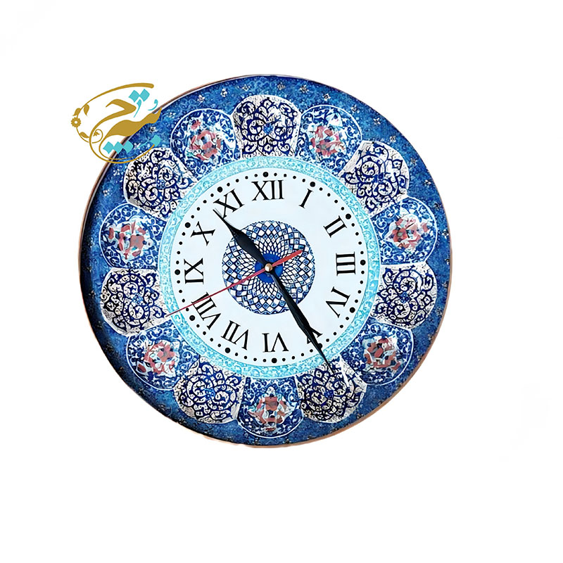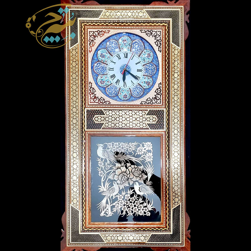 تلفیق چندین هنر، خروجیش قشنگتر و خاصتر از این کار نمیشه… صفحه ساعت که هنر میناکاری هست. قطر صفحه ساعت 25 سانته و موتور ساعت اصلی و با ضمانت و امضا استاد کار بدنه ساعت هنر خاتم هست. خاتم بسیار باکیفیت و پرسیم از نوع ستاره قطبی قلمزنی ساعت ابعادش 24در30 سانت هست و ظرافت قلمزنی رو میتونید ببینید. و درنهایت برق و درخشش بسیار عالی که داره؛ بخاطر چندین لایه پلی استری هست که روی کار خورده. این پلی استر هم باعث برق و درخشش کار میشه و هم کار ضد رطوبت میشه… ابعاد : 45در85 درسانتی متر