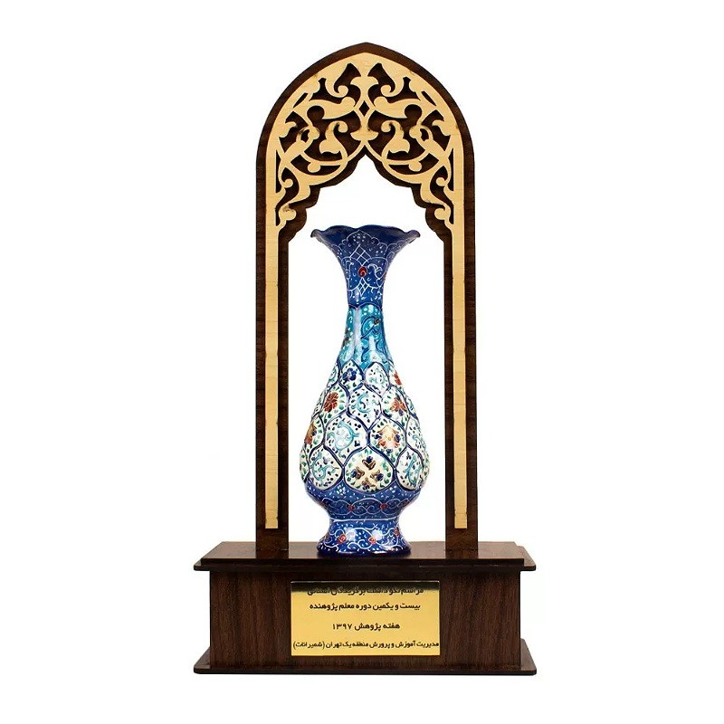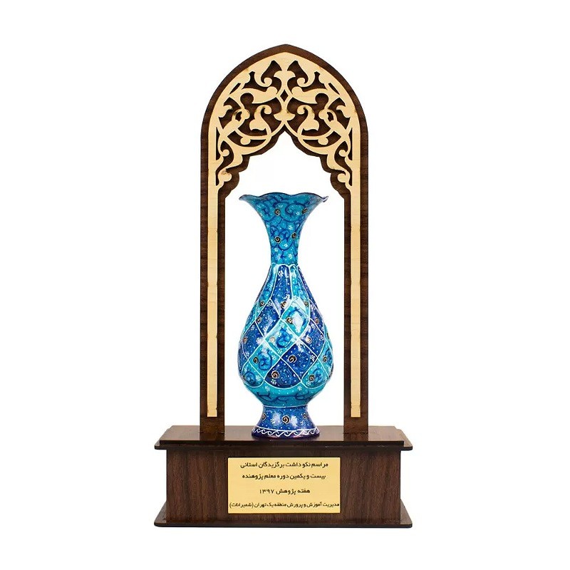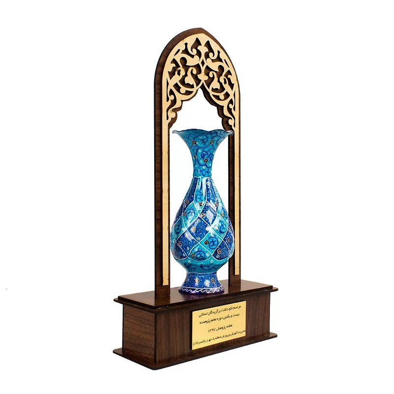 این تندیس تبلیغاتی صنایع دستی شامل گلدان میناکاری بر روی پایه چوبی با جعبه مقوایی سفید است. پایه تندیس چوبی لیزری با ابعاد 31×16×7 سانتیمتر. گلدان مسی میناکاری با نقاشی اسلیمی و ختایی ارتفاع 16 سانتیمتر. این هدیه تبلیغاتی ایرانی مناسب برای همایش ها،جشنواره، تجلیل از پرسنل و مدیران سازمان ها و ادارات و… میباشد