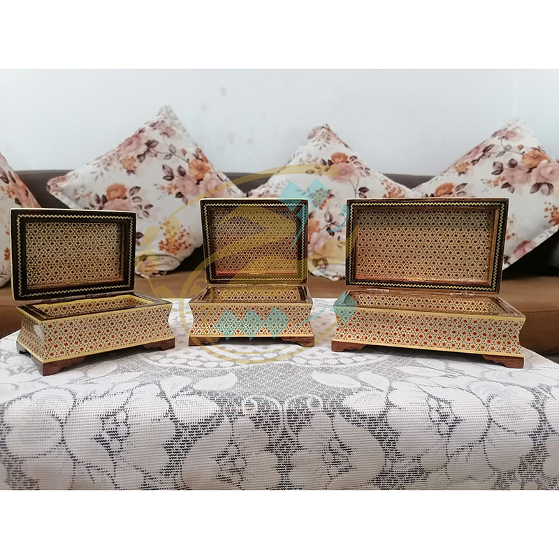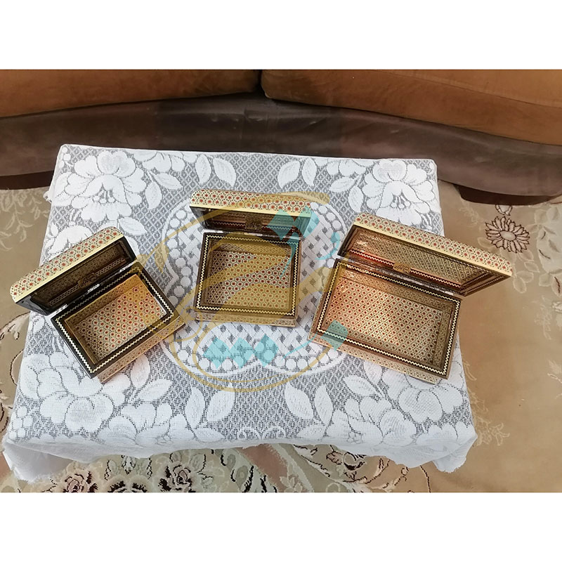 جعبه تمام خاتم کاری مخصوص هدیه های لاکچری و صادرات است و تولید آن کاملا انحصاری و مخصوص فروشگاه بُته چی می باشد، در ابعاد 10در12،10در14 و 10در16 موجود است. سفارش جزیی و کلی برای افراد بازرگان و هنرپسند امکان پذیر است.