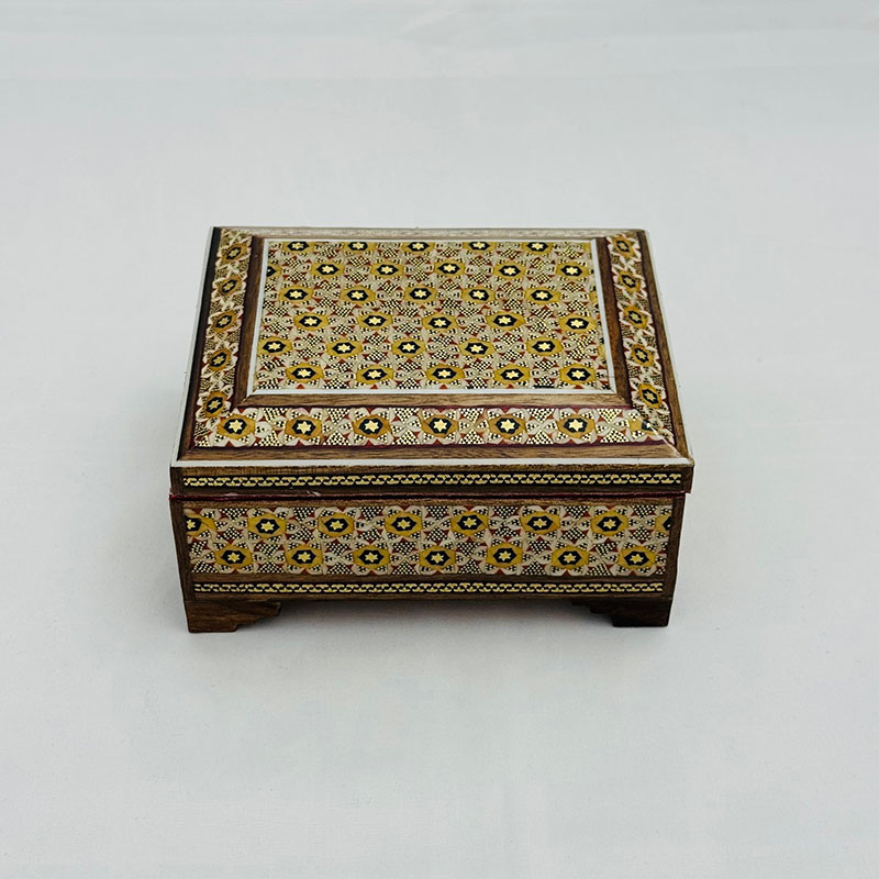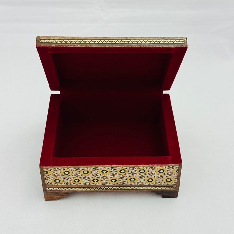 محصول بسیار زیبا و با کیفیت کاردست هنرمندان اصفهانی بسیار مناسب جهت دادن هدیه در داخل آن،مناسب جهت جاجواهراتی و……درب لولایی و داخل مخمل کارشده