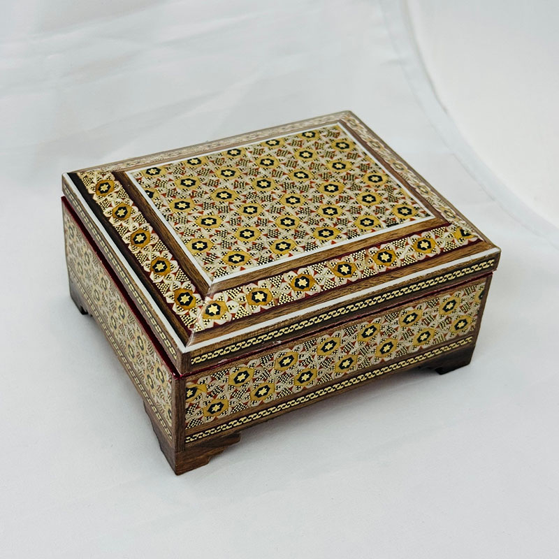 محصول بسیار زیبا و با کیفیت کاردست هنرمندان اصفهانی بسیار مناسب جهت دکور و قراردادن وسایل و اشیا ،همچنین دادن هدیه در داخل آن،مناسب جهت جاجواهراتی و……درب لولایی و داخل مخمل کارشده به ابعاد درج شده