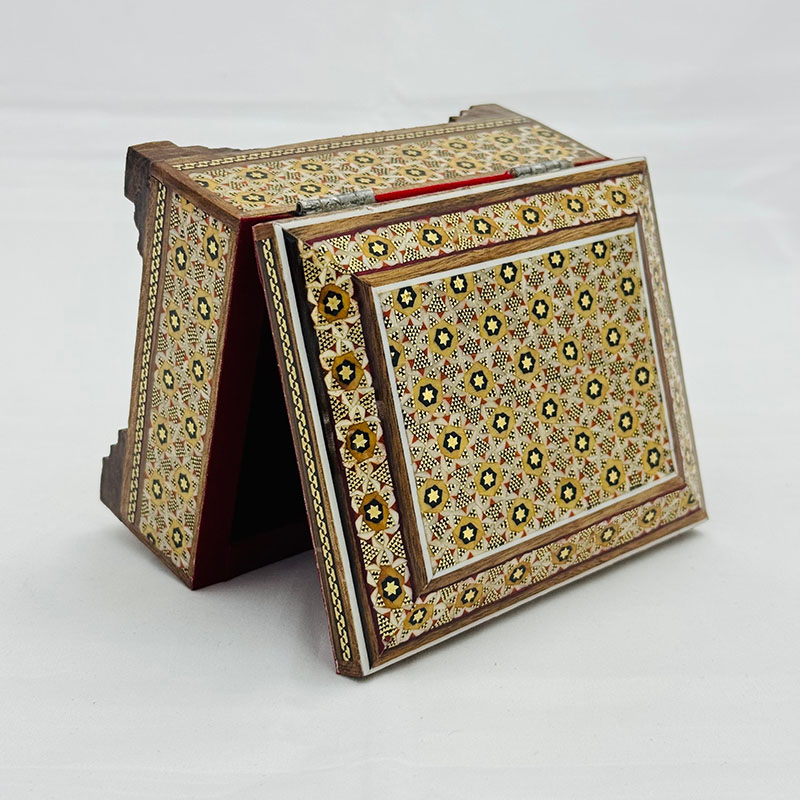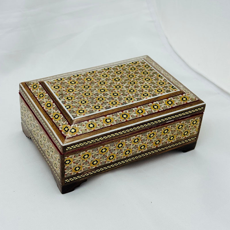 محصول بسیار زیبا و با کیفیت کاردست هنرمندان اصفهانی بسیار مناسب جهت دکور و قراردادن وسایل و اشیا ،همچنین دادن هدیه در داخل آن،مناسب جهت جاجواهراتی و……درب لولایی و داخل مخمل کارشده به ابعاد درج شده