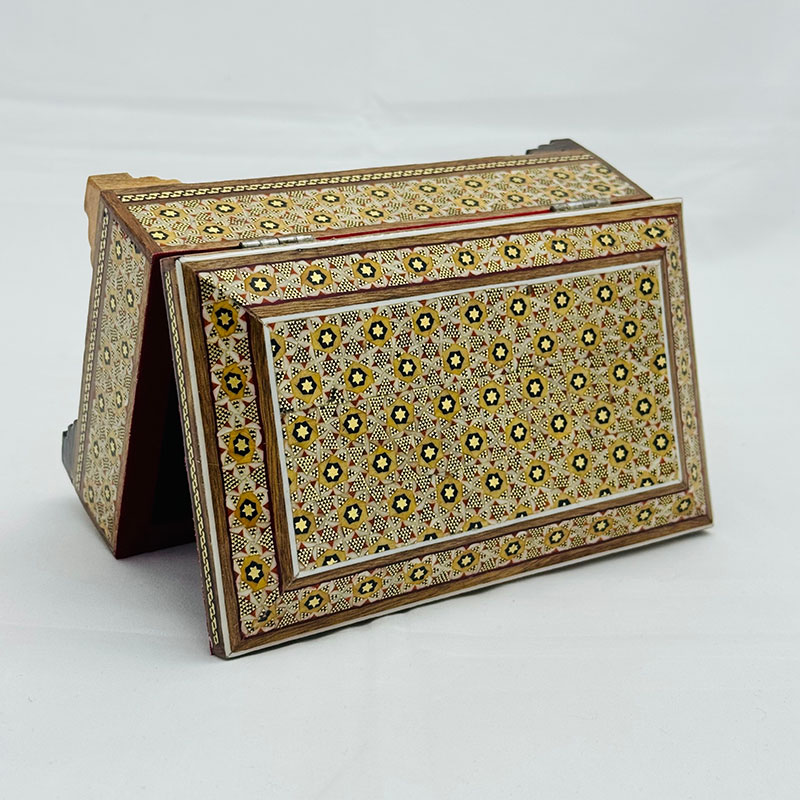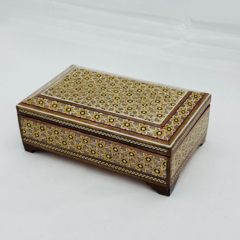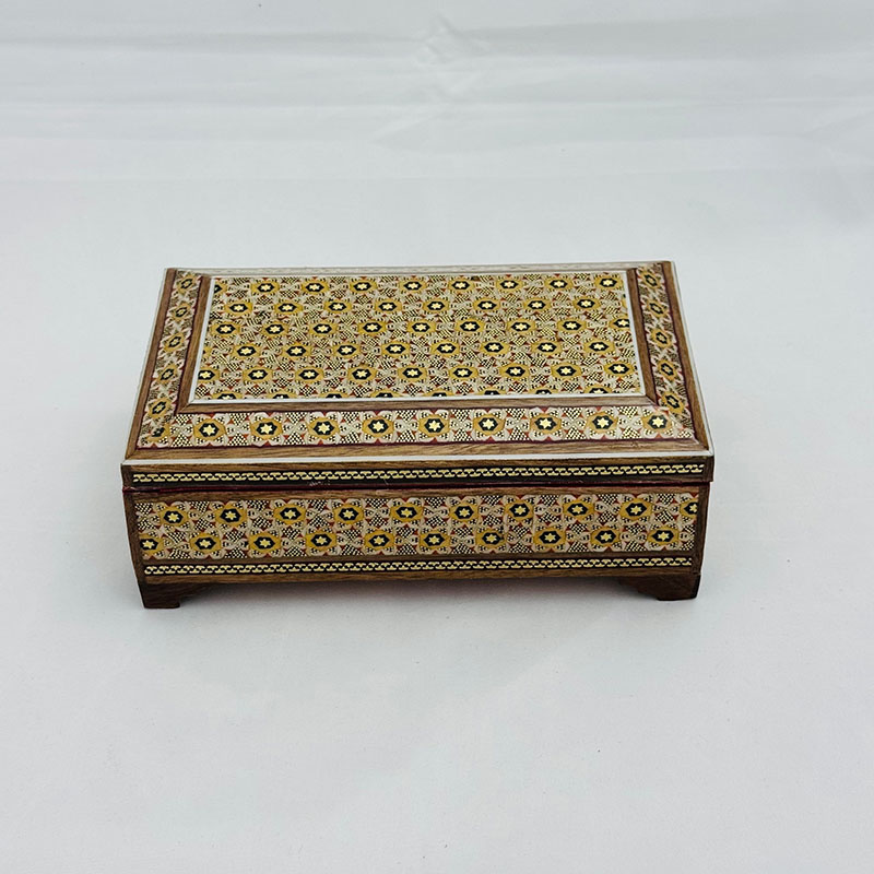 محصول بسیار زیبا و با کیفیت کاردست هنرمندان اصفهانی بسیار مناسب جهت دکور و قراردادن وسایل و اشیا ،همچنین دادن هدیه در داخل آن،مناسب جهت جاجواهراتی و……درب لولایی و داخل مخمل کارشده به ابعاد درج شده