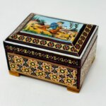 محصول بسیار زیبا و با کیفیت کاردست هنرمندان اصفهانی بسیار مناسب جهت دادن هدیه در داخل آن،مناسب جهت جاجواهراتی و……درب لولایی و داخل مخمل کارشده