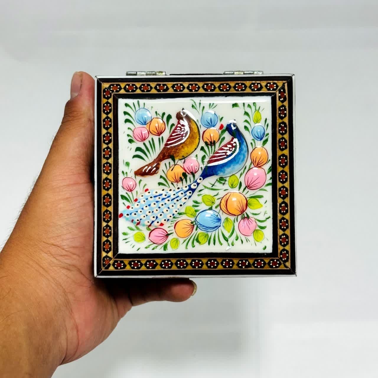 محصول بسیار زیبا و با کیفیت کاردست هنرمندان اصفهانی بسیار مناسب جهت دادن هدیه در داخل آن،مناسب جهت جاجواهراتی و……درب لولایی و داخل مخمل کارشده