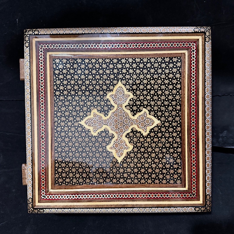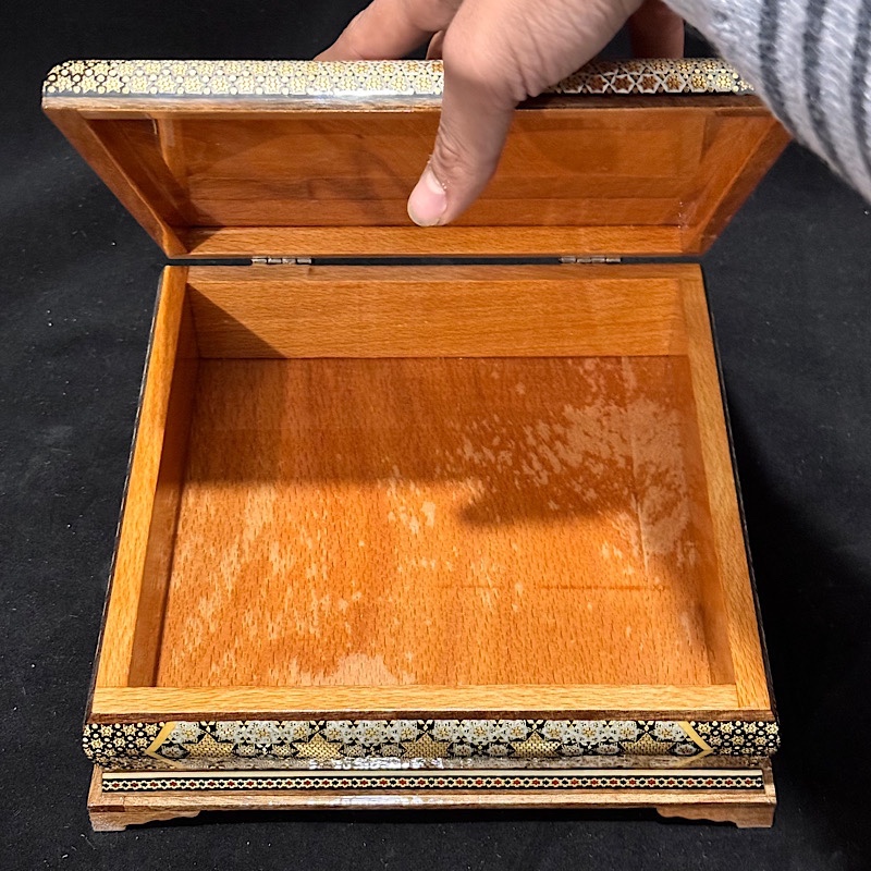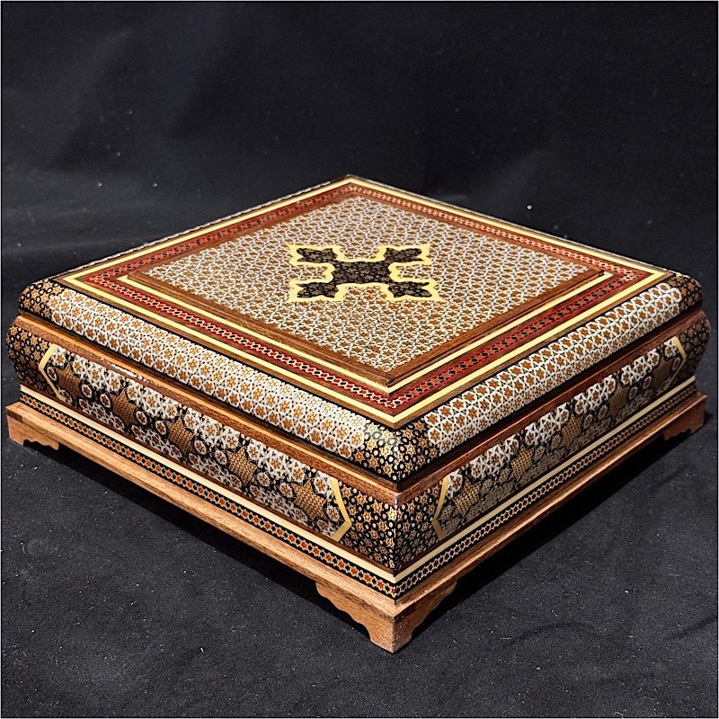 محصول بسیار زیبا و با کیفیت کاردست هنرمندان اصفهانی بسیار مناسب جهت پذیرایی و قراردادن کاردوچنگال یا قاشق،همچنین دادن هدیه در داخل آن،مناسب جهت جاجواهراتی و……درب لولایی و داخل روکش چوب راش کارشده به ابعاد 25در25 سانتی متر