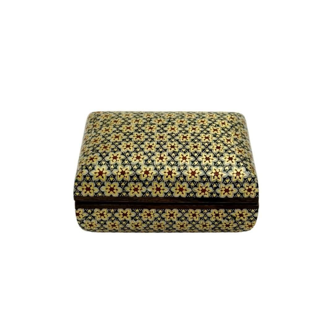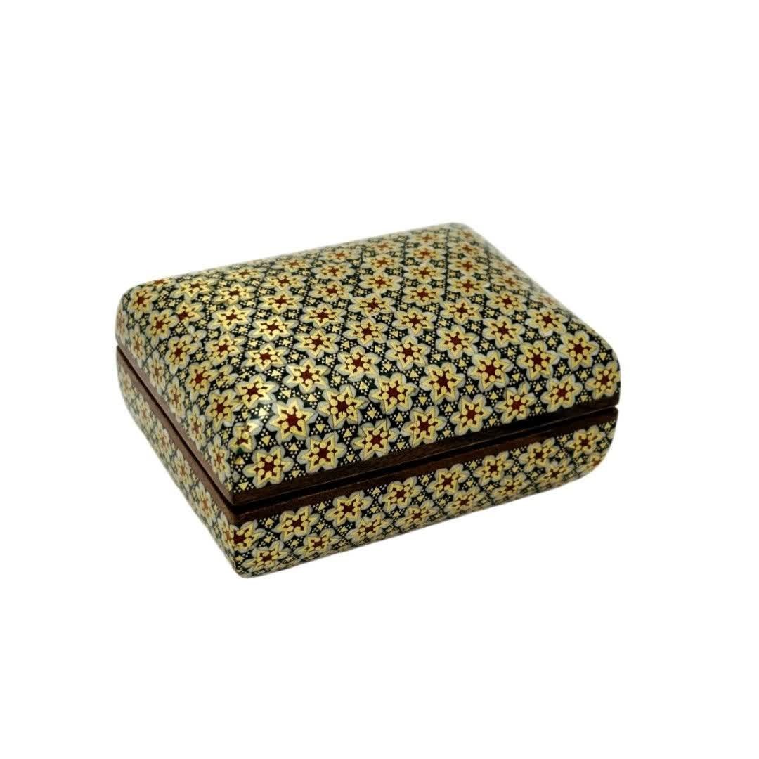 همانگونه که میدانیم هنر خاتمکاری از جمله صنایع دستی قدیمی ایران است و یکی از هنرهای برجسته و مهم ما میباشد. خاتم، ترکیبی از چندضلعیهای بسیار کوچک است که به طور منظم در ابعاد پنج ضلعی، شش ضلعی، هفت ضلعی، هشت ضلعی و یا ده ضلعی در کنار هم قرار میگیرد. انواع جعبه خاتم کاری جواهرات این هنر نیاز به ظرافت و دقت و حوصله زیادی دارد، میزان مرغوبیت یک وسیلۀ خاتمکاری شده به میزان ریز و ظریف بودن مثلثهای کنار هم قرار داده شده، یا همان چند ضلعی ها دارد. یعنی هر چقدر این چند ضلعی های کنار هم قرار داده شده، ریزتر و ظریفتر باشند آن خاتمکاری مرغوب و ارزشمندتر است. محصول بسیار زیبا و با کیفیت کاردست هنرمندان اصفهانی بسیار مناسب جهت پذیرایی و قراردادن کاردوچنگال یا قاشق،همچنین دادن هدیه در داخل آن،مناسب جهت جاجواهراتی و……درب لولایی و داخل خاتم کاری تمام به ابعاد 10در20 سانتی متر