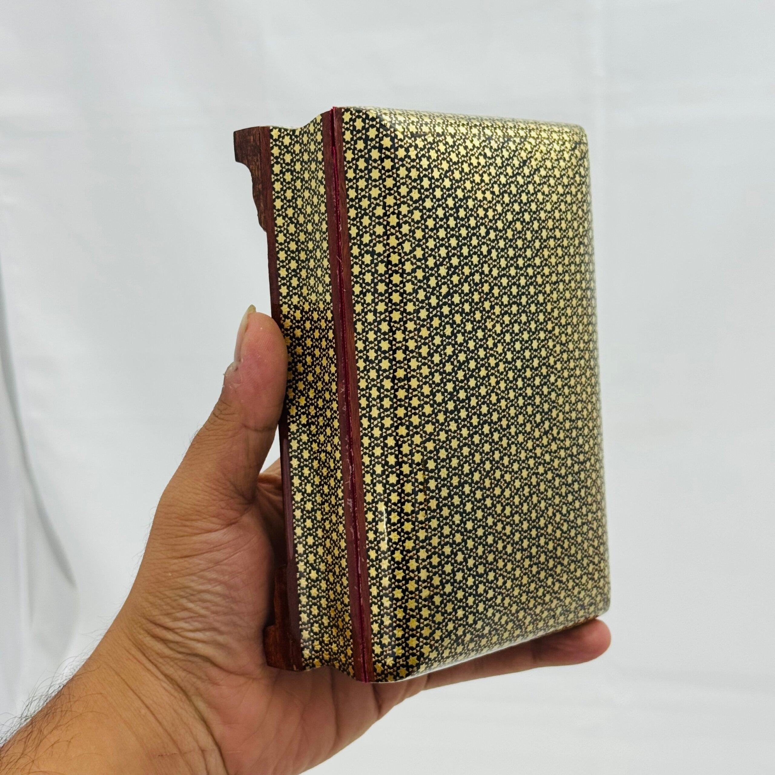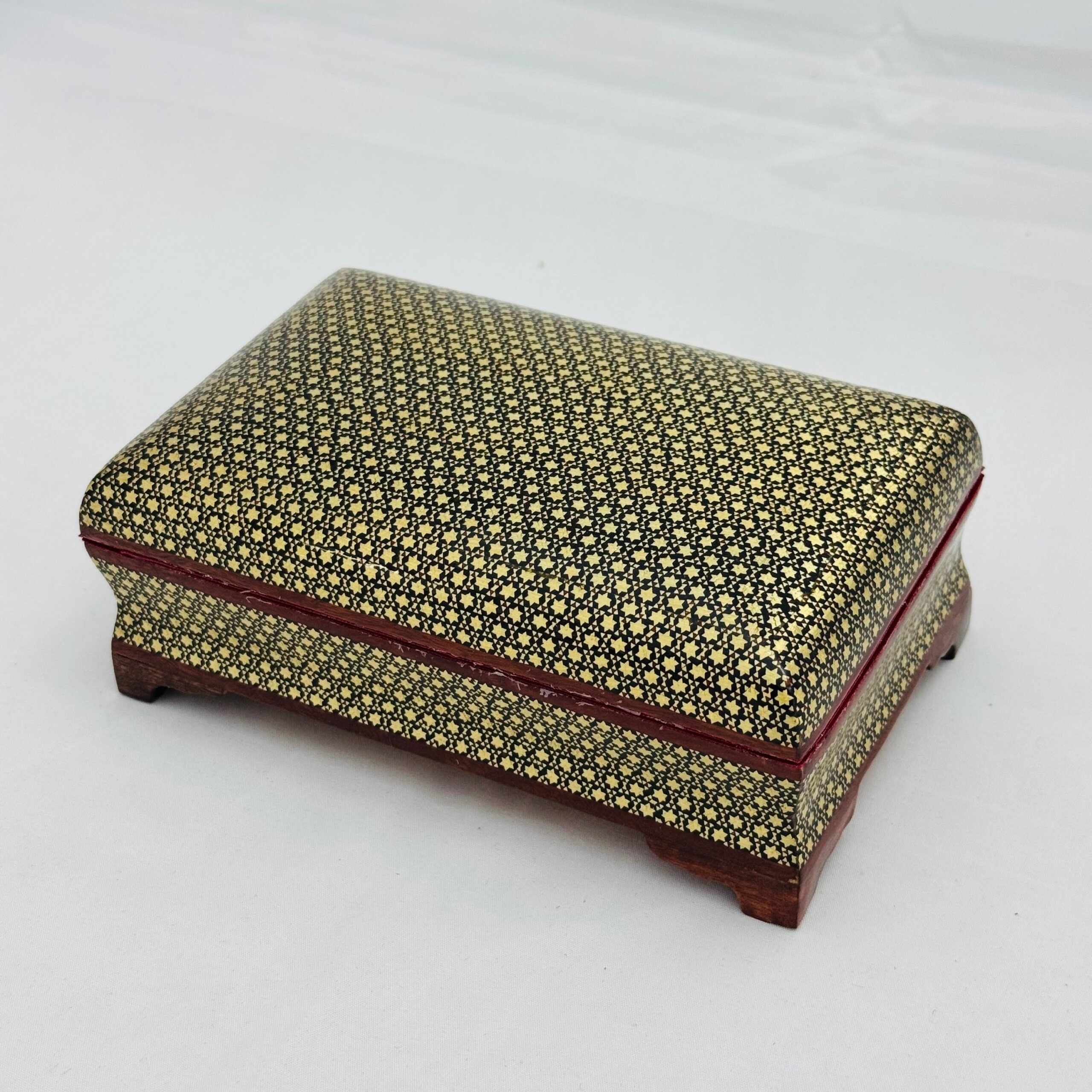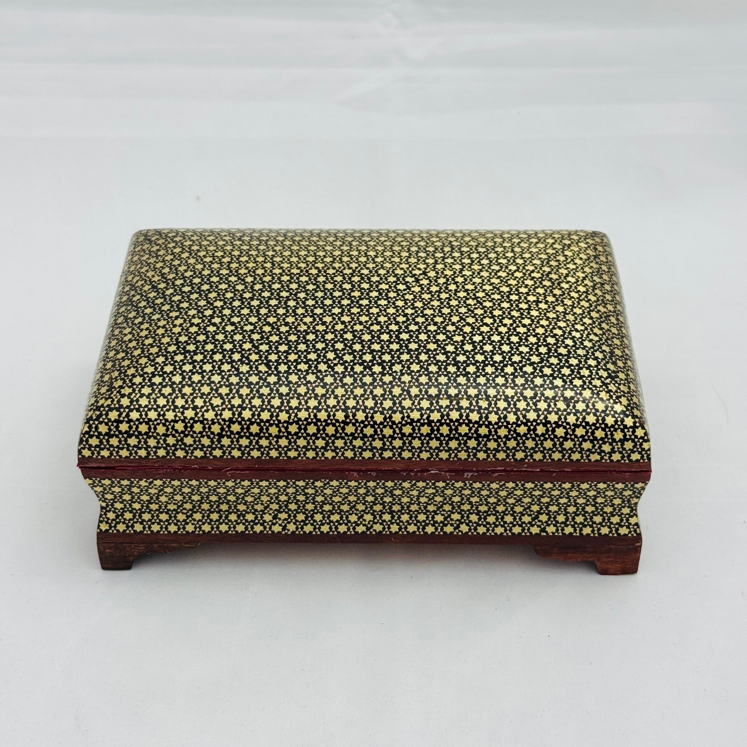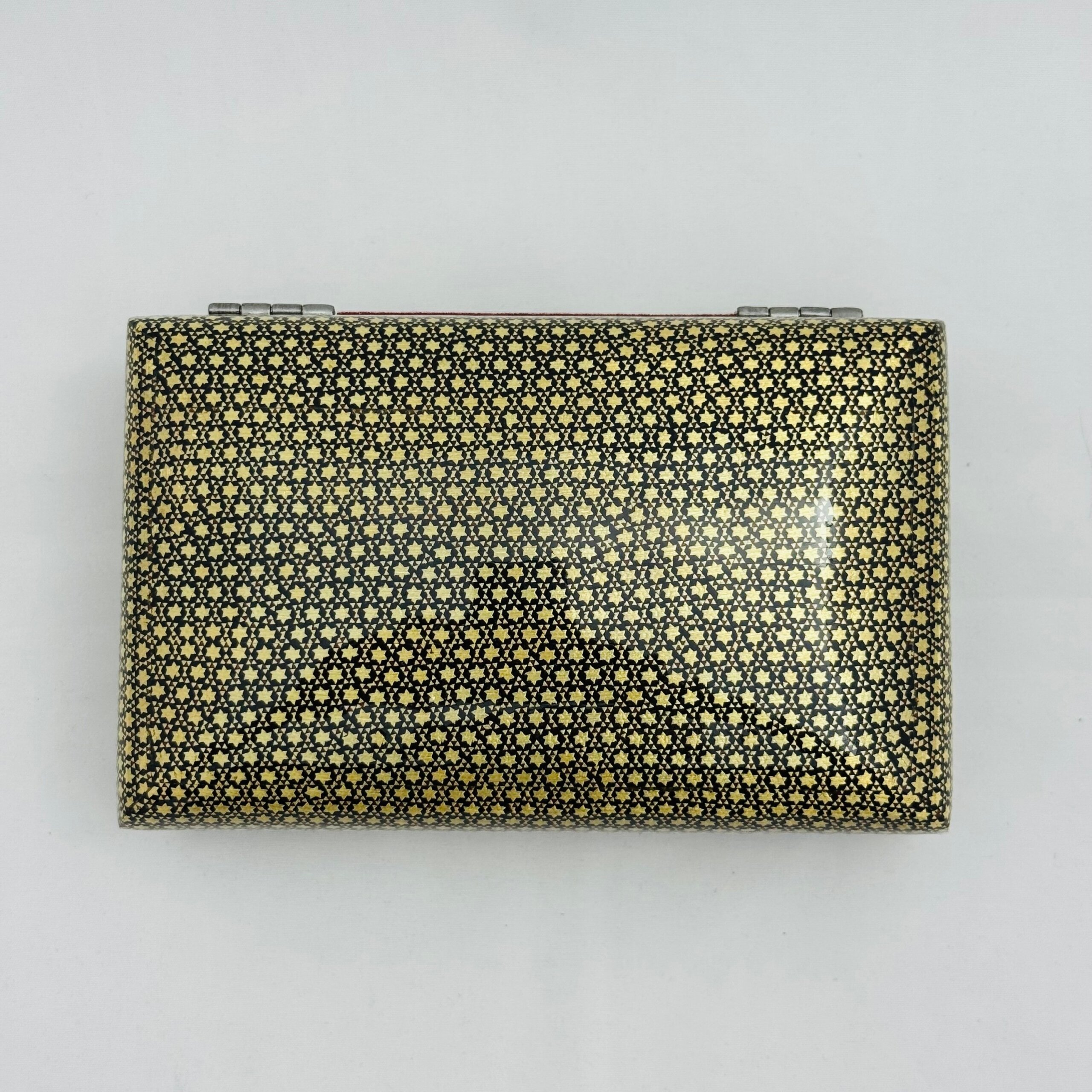 معرفی محصول: جعبه خاتم کاری مدل کهکشانی بغل کاس مشکی 10در16 ساختهی هنرمندان اصفهانی، با دقت و ظرافت فوقالعاده در طراحی و تولید. مناسب دکوراسیون لوکس و هدیهای خاص.