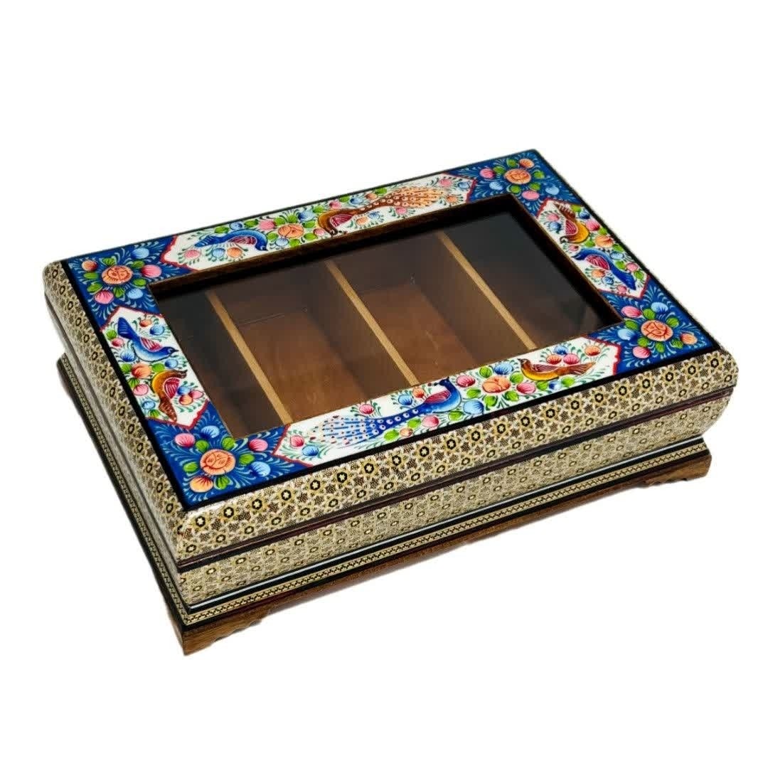 جعبه خاتم کاری مدل گل و بلبل درب شیشه ای