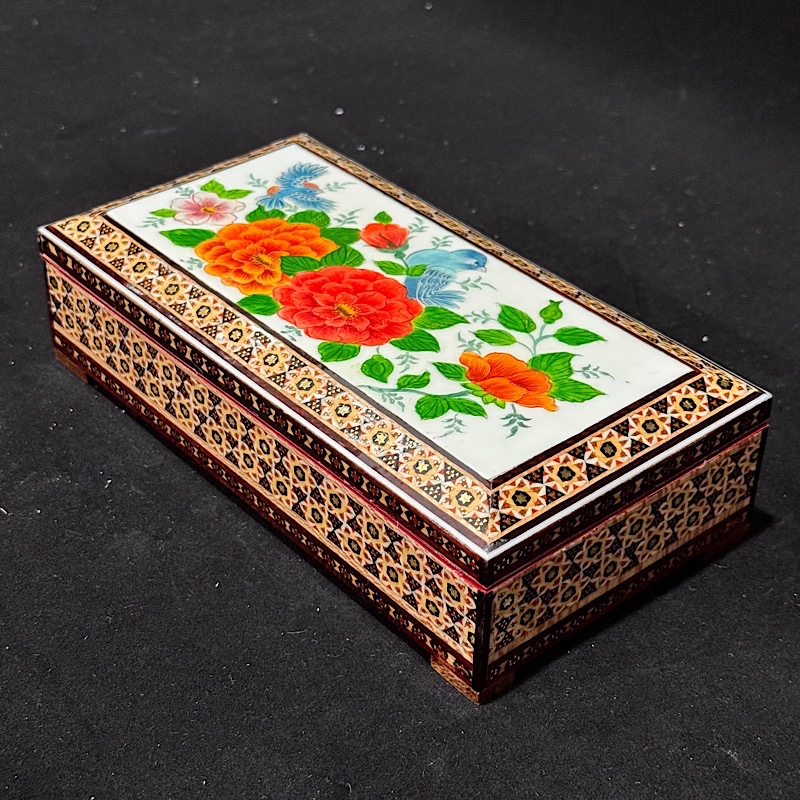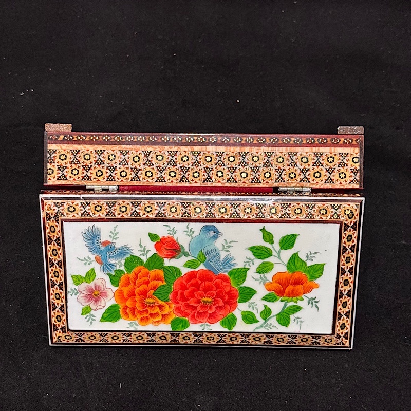 جعبه خاتم کاری گل و مرغ پرداز نمونهای از هنر اصیل ایرانی است که با ظرافت و دقت فراوان تولید شده است.