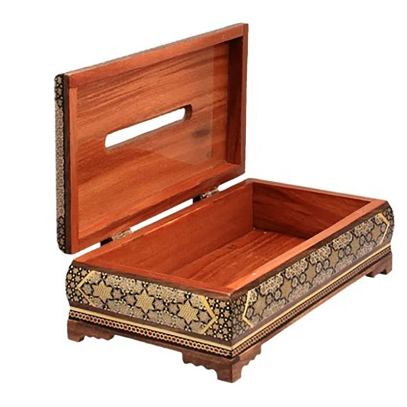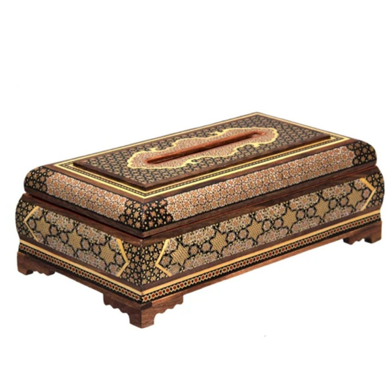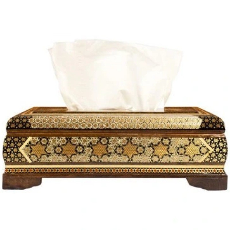 ⚜️جعبه دستمال خاتم‌کاری اعلا اصفهان را می توان پرطرفدار ترین محصول صنایع دستی خاتم سازی اصفهان نام برد. شما می توانید برای زیباتر نشان دادن جعبه های دستمال کلینکس از جادستمال کاغذی خاتم کاری استفاده کنید. ⚜️جعبه دستمال خاتم کاری یکی از نمادهای هنر استادکاران خاتم ساز اصفهان است. جا دستمال خاتم کاری موردهای استفاده زیادی در منازل و دفاتر کار دارد.از این رو برای هدیه به دوستان و اقوام و یا حتی هدایای تبلیغاتی خاتم کاری صنایع دستی گزینه مناسبی است. ⚜️قیمت جعبه دستمال مناسب و خرید آن از سراسر کشور امکان پذیر است. هنر خاتم کاری اصفهان و خاتم کاری شیراز از شناخته شده ترین هنرهای دستی ایرانی محسوب می گردند که علاقه مندان زیادی در داخل و خارج کشور دارند.