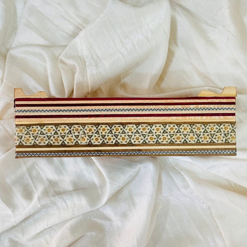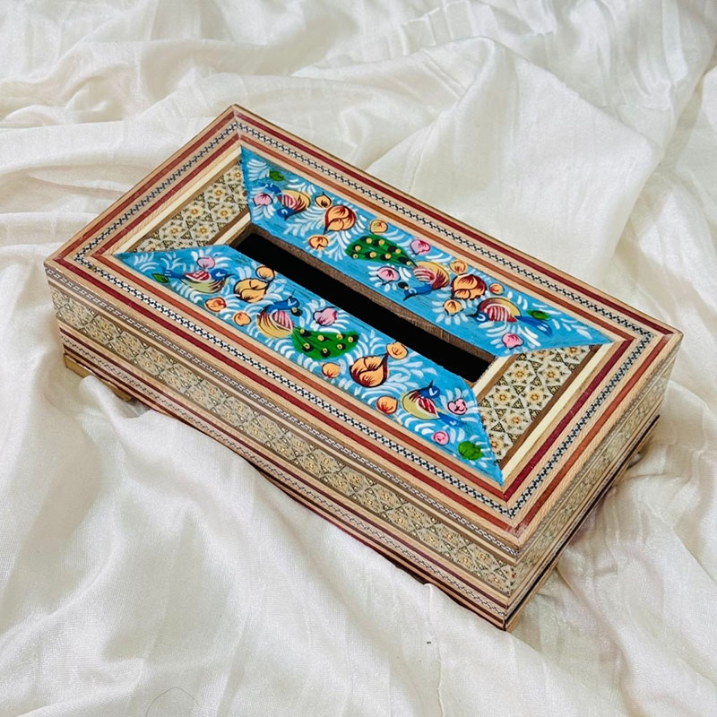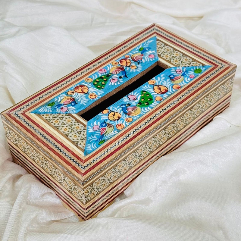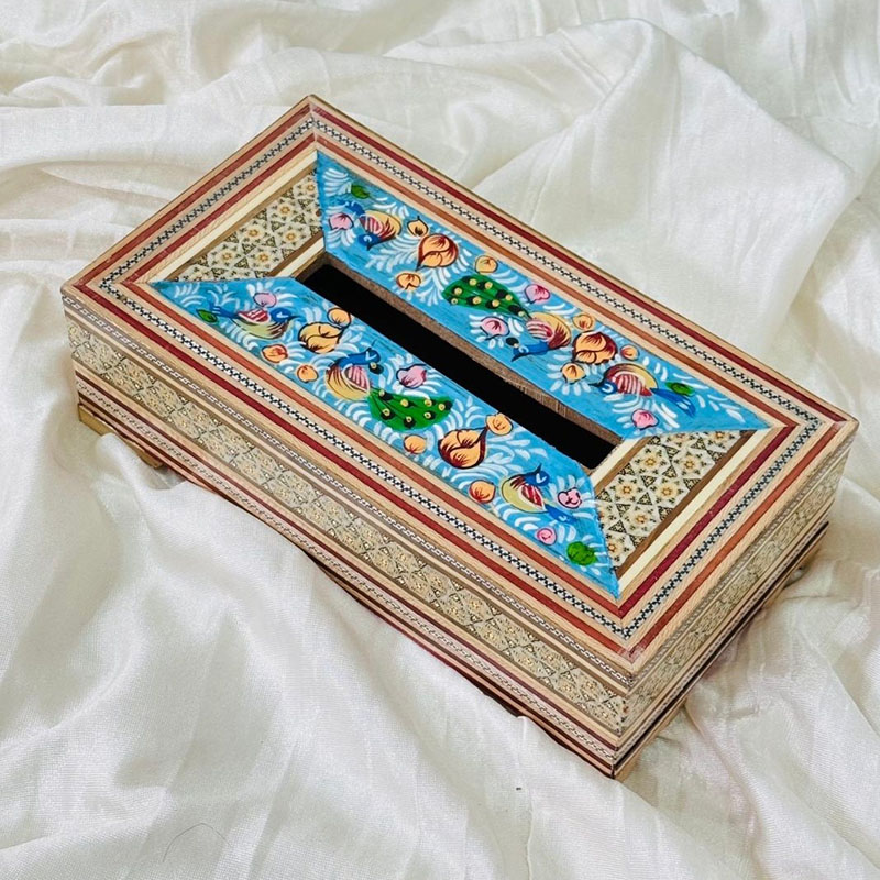 ⚜️جعبه دستمال خاتم کاری محصولی زیبا و چشم نواز تولید شده در صنایع دستی بُته چی ⚜️جا دستمالی خاتم یکی دیگر از زیباترین محصولات خاتم کاری در بازار است. ⚜️این محصول دارای وزن ۵۱۰ گرم بوده و در اندازه ۱۰*۱۴*۲۶ سانتی متر تولید شده است. ⚜️جنس این جادستمال کاغذی از چوب بوده که همانگونه که در تصویر نیز مشاهده میکنید از هنر خاتم کاری برای تزیین آن استفاده شده است. ⚜️ درب این جادستمال کاغذی به صورت کشویی است. ⚜️ترکیب رنگ های مختلف به کار رفته در ساخت این محصول سبب شده تا یکی از بهترین محصولات چوبی و خاتم در بازار به شمار برود.