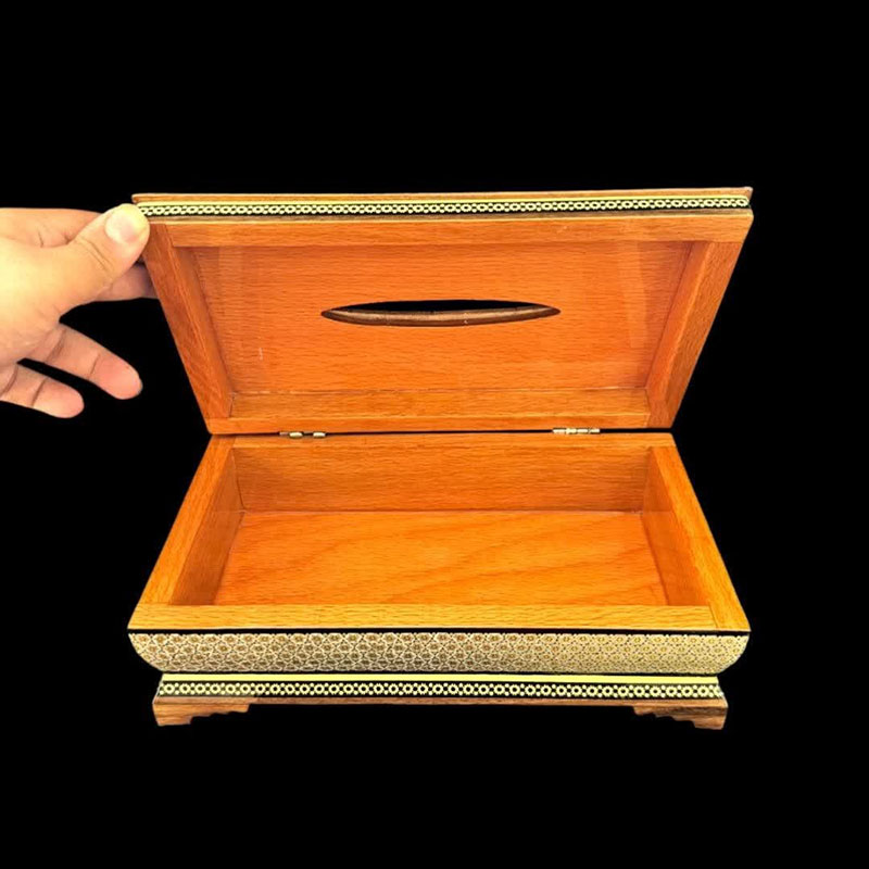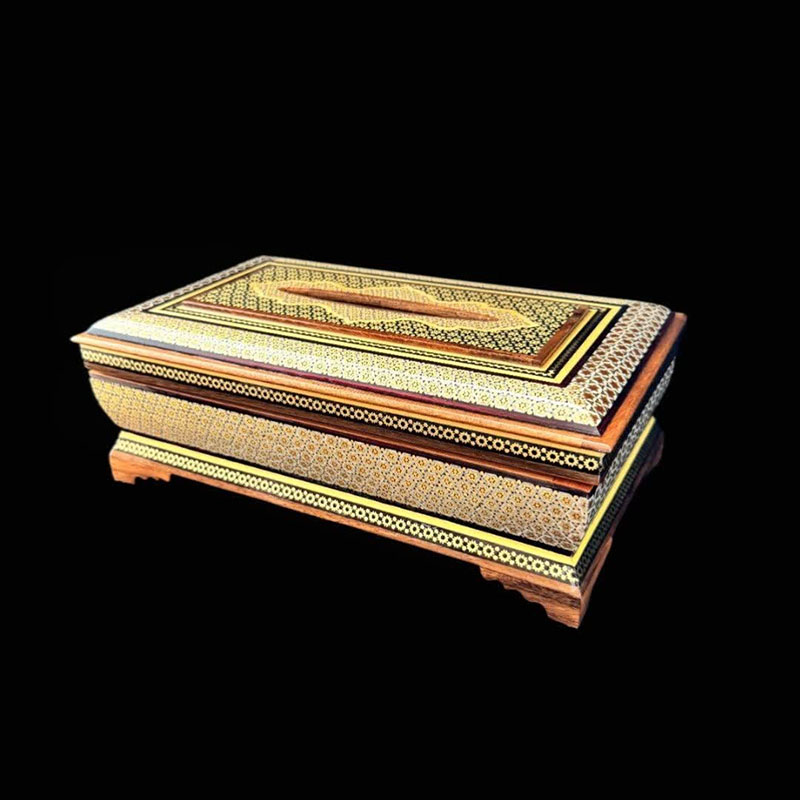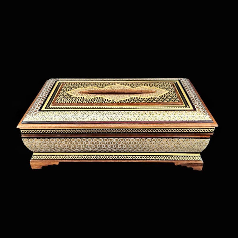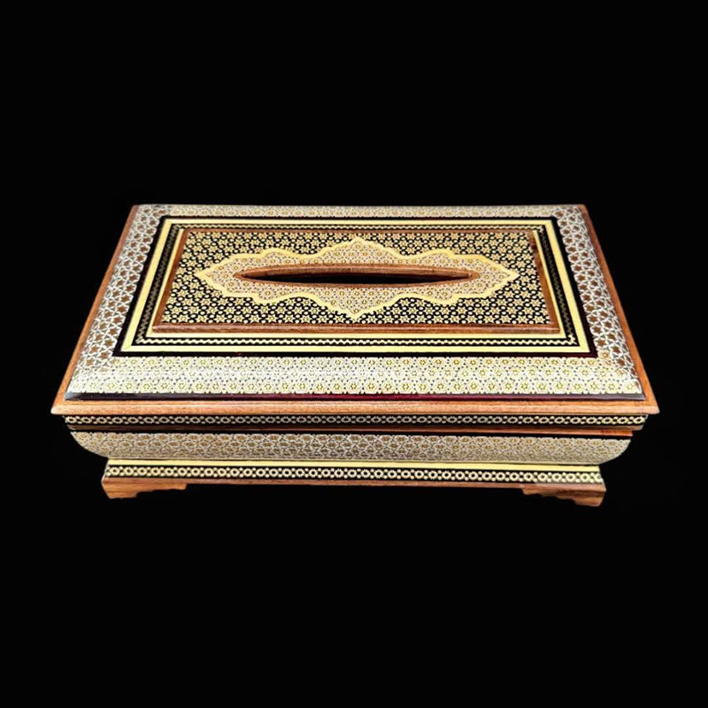 ⚜️جعبه دستمال کاغذی خاتم اعلا اصفهان را می توان پرطرفدار ترین محصول صنایع دستی خاتم سازی اصفهان نام برد. شما می توانید برای زیباتر نشان دادن جعبه های دستمال کلینکس از جادستمال کاغذی خاتم کاری استفاده کنید. ⚜️جعبه دستمال خاتم کاری یکی از نمادهای هنر استادکاران خاتم ساز اصفهان است. جا دستمال خاتم کاری موردهای استفاده زیادی در منازل و دفاتر کار دارد.از این رو برای هدیه به دوستان و اقوام و یا حتی هدایای تبلیغاتی خاتم کاری صنایع دستی گزینه مناسبی است. ⚜️قیمت جعبه دستمال خاتم مناسب و خرید آن از سراسر کشور امکان پذیر است. هنر خاتم کاری اصفهان و خاتم کاری شیراز از شناخته شده ترین هنرهای دستی ایرانی محسوب می گردند که علاقه مندان زیادی در داخل و خارج کشور دارند.