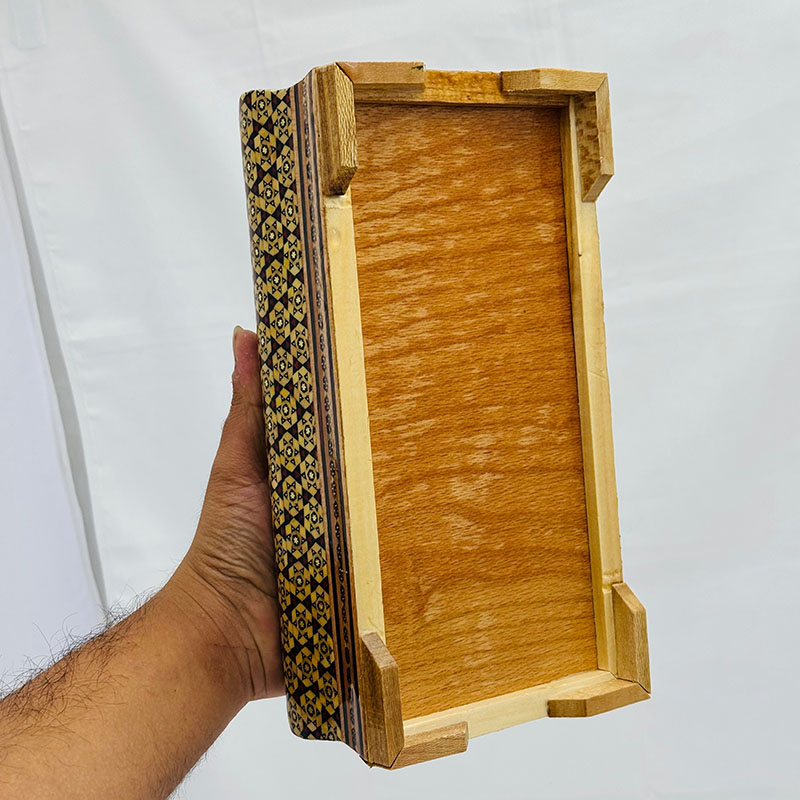 ⚜️جعبه دستمال خاتم کاری محصولی زیبا و چشم نواز تولید شده در صنایع دستی بُته چی ⚜️جا دستمالی خاتم یکی دیگر از زیباترین محصولات خاتم کاری در بازار است. ⚜️این محصول دارای وزن ۵۱۰ گرم بوده و در اندازه ۱۰*۱۴*۲۶ سانتی متر تولید شده است. ⚜️جنس این جادستمال کاغذی از چوب بوده که همانگونه که در تصویر نیز مشاهده میکنید از هنر خاتم کاری برای تزیین آن استفاده شده است. ⚜️ درب این جادستمال کاغذی به صورت کشویی است. ⚜️ترکیب رنگ های مختلف به کار رفته در ساخت این محصول سبب شده تا یکی از بهترین محصولات چوبی و خاتم در بازار به شمار برود.