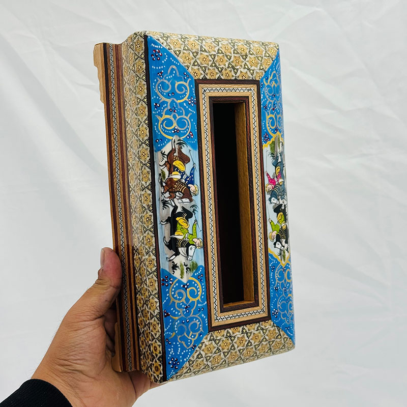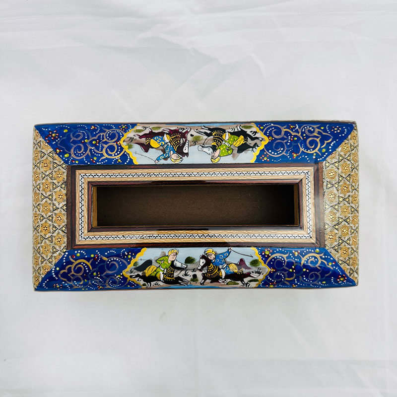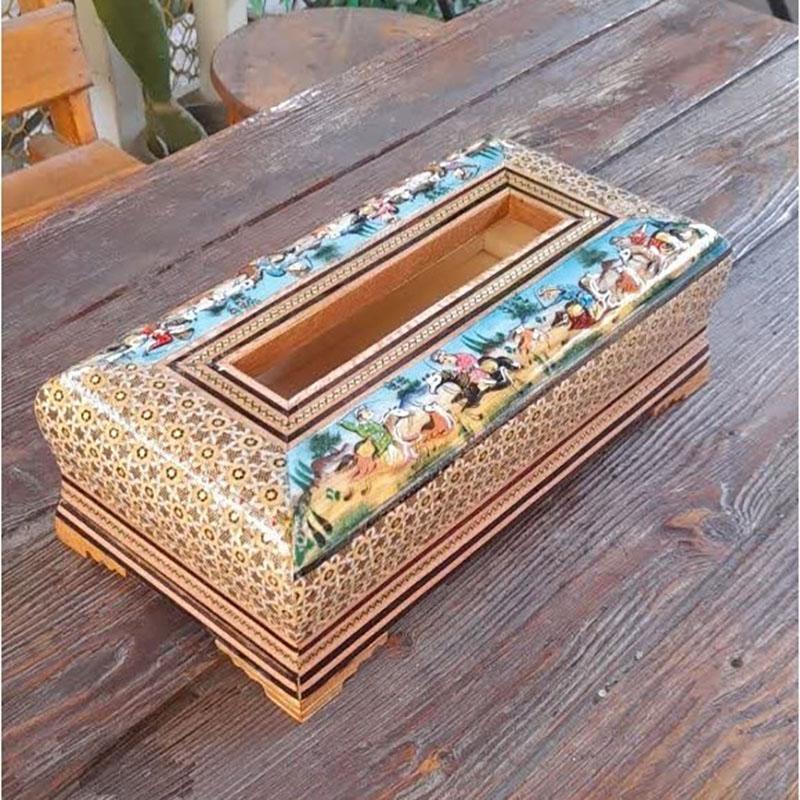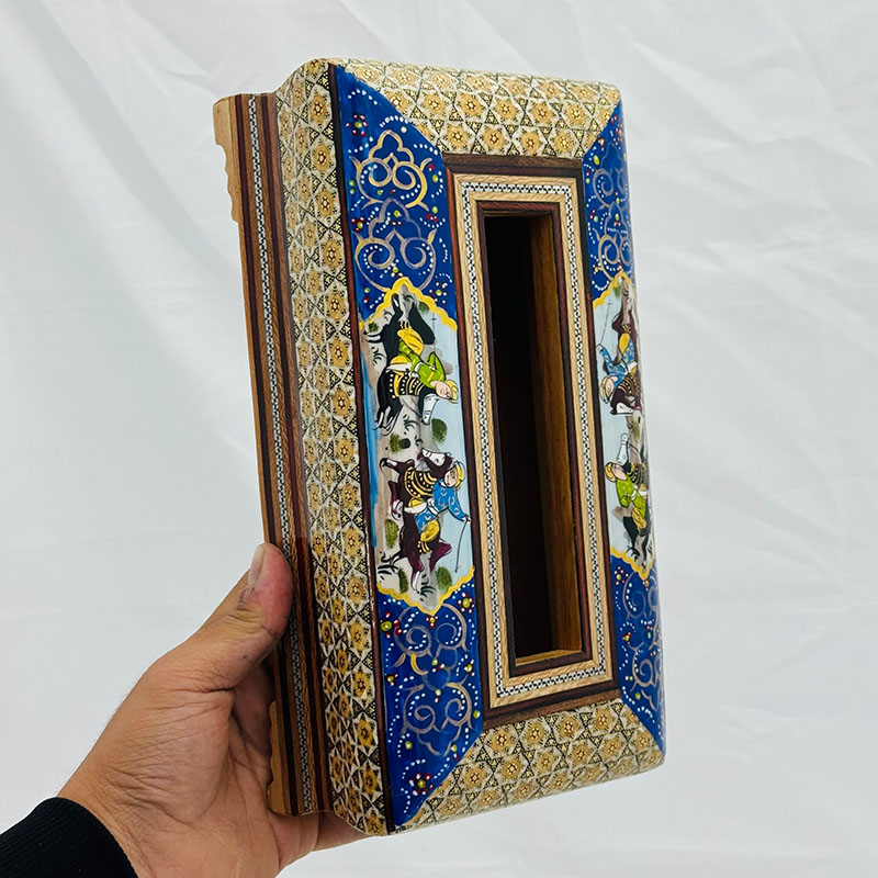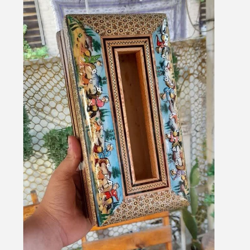⚜️جعبه دستمال کاغذی خاتم اعلا اصفهان را می توان پرطرفدار ترین محصول صنایع دستی خاتم سازی اصفهان نام برد. شما می توانید برای زیباتر نشان دادن جعبه های دستمال کلینکس از جادستمال کاغذی خاتم کاری استفاده کنید. ⚜️جعبه دستمال خاتم کاری یکی از نمادهای هنر استادکاران خاتم ساز اصفهان است. جا دستمال خاتم کاری موردهای استفاده زیادی در منازل و دفاتر کار دارد.از این رو برای هدیه به دوستان و اقوام و یا حتی هدایای تبلیغاتی خاتم کاری صنایع دستی گزینه مناسبی است. ⚜️قیمت جعبه دستمال خاتم مناسب و خرید آن از سراسر کشور امکان پذیر است. هنر خاتم کاری اصفهان و خاتم کاری شیراز از شناخته شده ترین هنرهای دستی ایرانی محسوب می گردند که علاقه مندان زیادی در داخل و خارج کشور دارند.