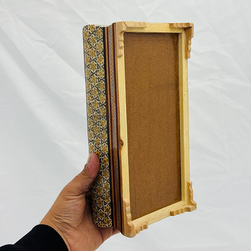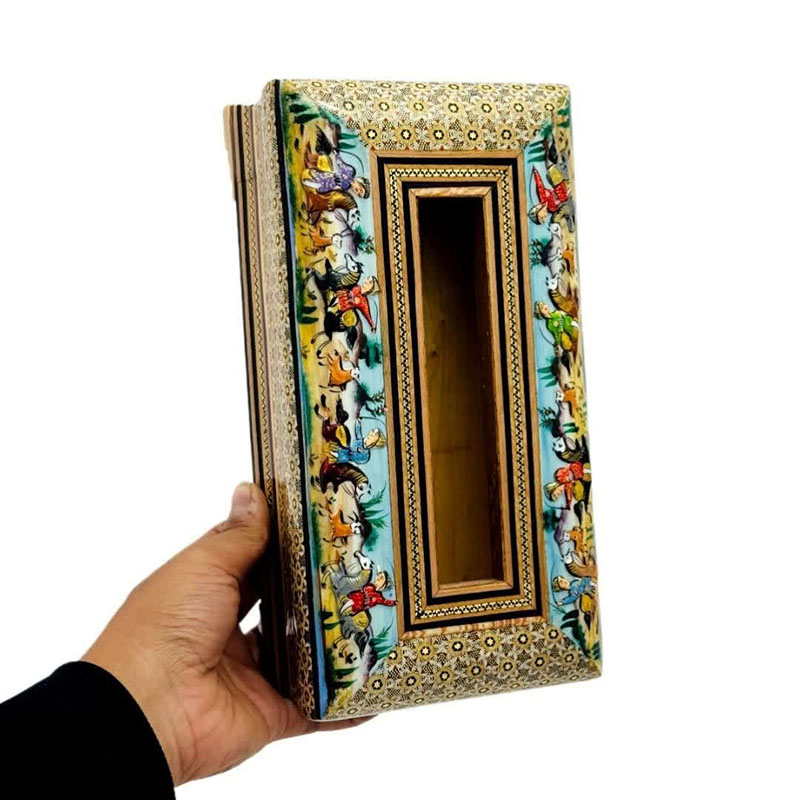 ⚜️جعبه دستمال خاتم کاری محصولی زیبا و چشم نواز تولید شده در صنایع دستی بُته چی ⚜️جا دستمالی خاتم یکی دیگر از زیباترین محصولات خاتم کاری در بازار است. ⚜️این محصول دارای وزن ۵۱۰ گرم بوده و در اندازه ۱۰*۱۴*۲۶ سانتی متر تولید شده است. ⚜️جنس این جادستمال کاغذی از چوب راش بوده که همانگونه که در تصویر نیز مشاهده میکنید از هنر خاتم کاری برای تزیین آن استفاده شده است. ⚜️ درب این جادستمال کاغذی به صورت لولایی است. ⚜️ترکیب رنگ های مختلف به کار رفته در ساخت این محصول سبب شده تا یکی از بهترین محصولات چوبی و خاتم در بازار به شمار برود.