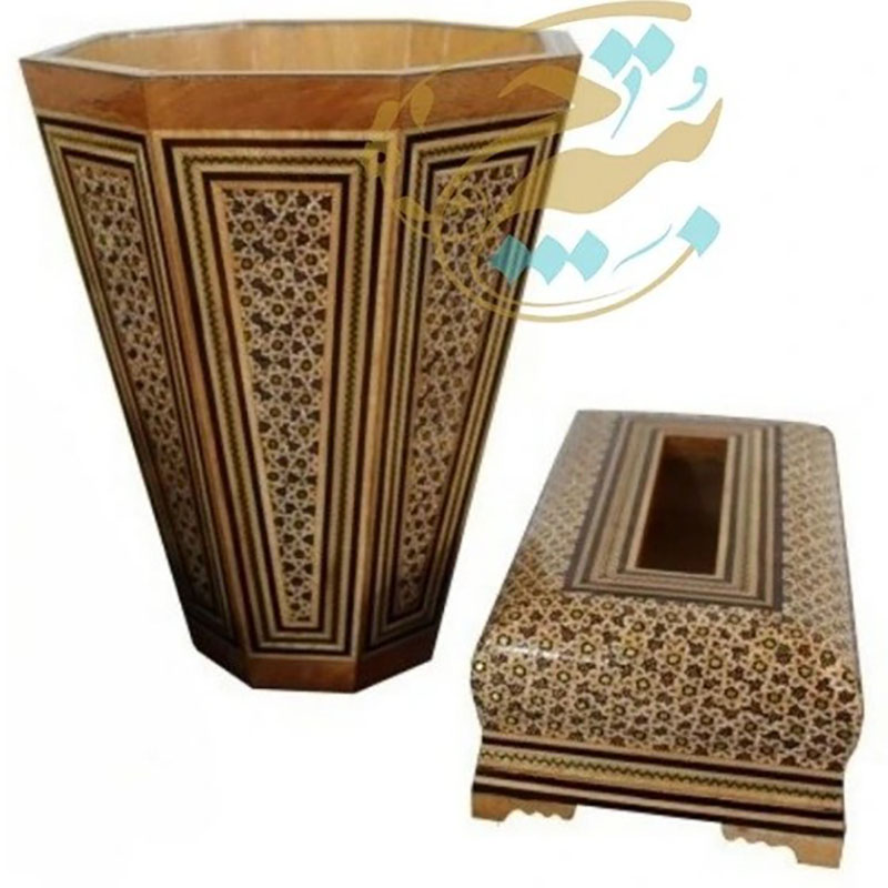 ⚜️ست جعبه دستمال کاغذی و سطل خاتم کاری اصفهان را می توان پرطرفدار ترین محصول صنایع دستی خاتم سازی اصفهان نام برد. شما می توانید برای زیباتر نشان دادن جعبه های دستمال کلینکس از جادستمال کاغذی خاتم کاری استفاده کنید. ⚜️جعبه دستمال خاتم کاری یکی از نمادهای هنر استادکاران خاتم ساز اصفهان است. جا دستمال خاتم کاری موردهای استفاده زیادی در منازل و دفاتر کار دارد.از این رو برای هدیه به دوستان و اقوام و یا حتی هدایای تبلیغاتی خاتم کاری صنایع دستی گزینه مناسبی است. ⚜️قیمت جعبه دستمال خاتم مناسب و خرید آن از سراسر کشور امکان پذیر است. هنر خاتم کاری اصفهان و خاتم کاری شیراز از شناخته شده ترین هنرهای دستی ایرانی محسوب می گردند که علاقه مندان زیادی در داخل و خارج کشور دارند.