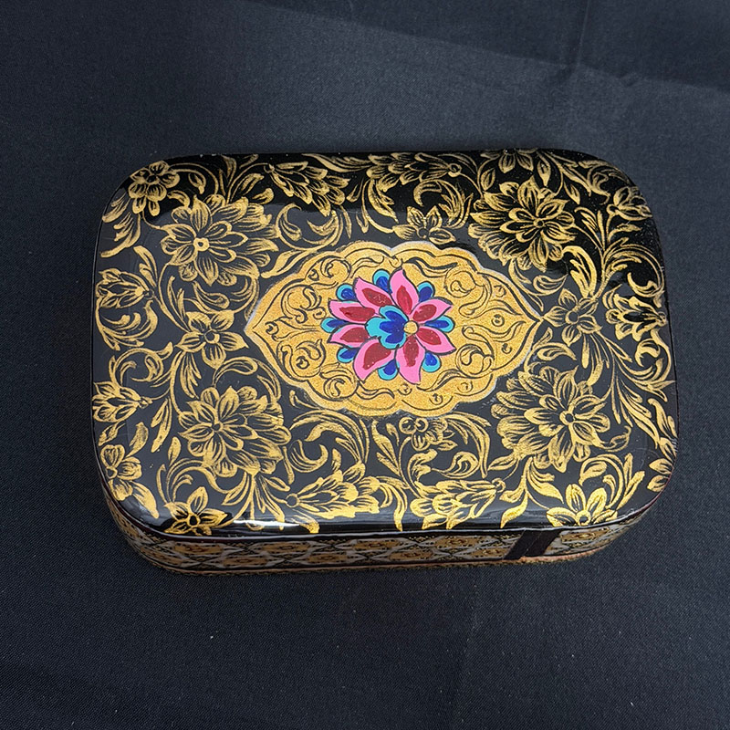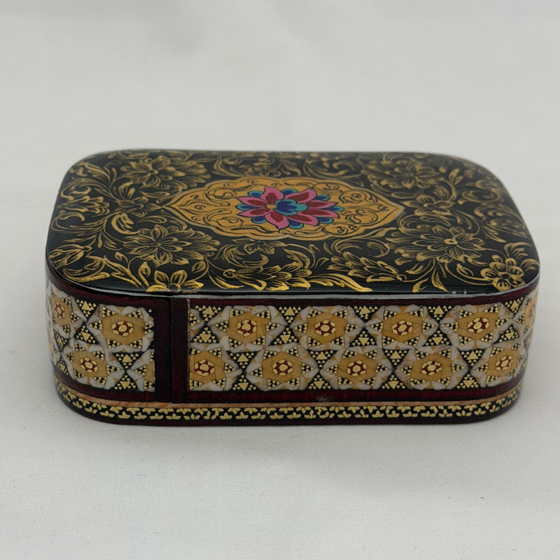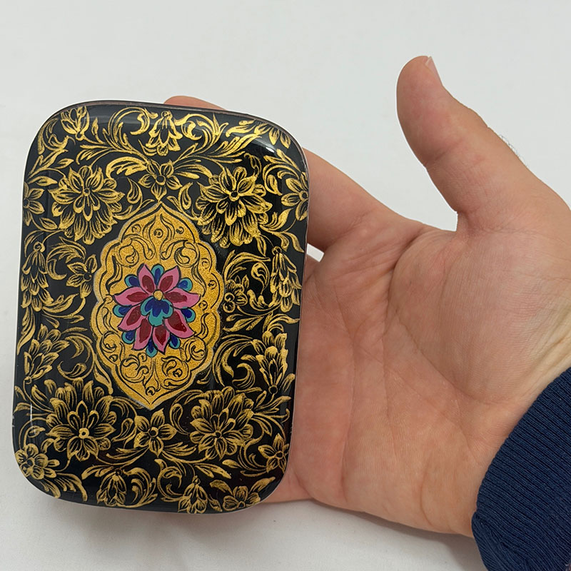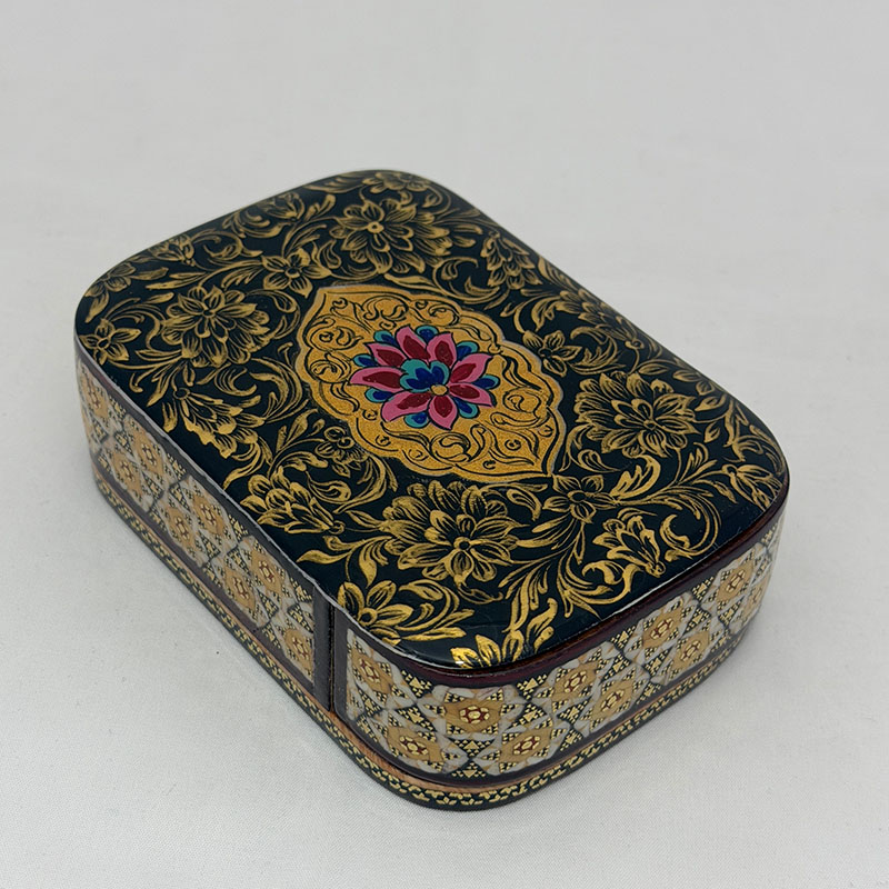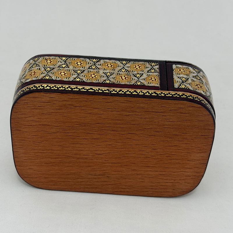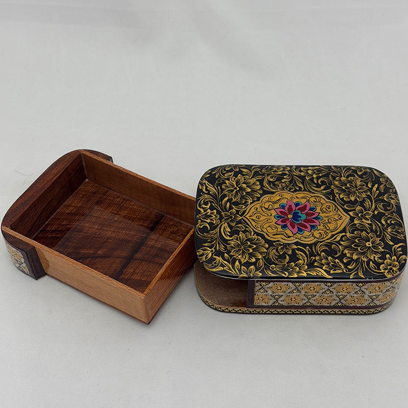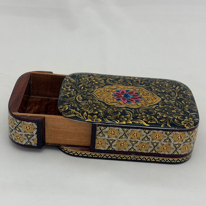 محصول بسیار زیبا و با کیفیت کاردست هنرمندان اصفهانی بسیار برای دادن هدیه در داخل آن،مناسب جهت جاجواهراتی و……درب کشویی و داخل راش کارشده به ابعاد 8در11سانتی متر