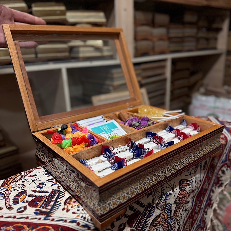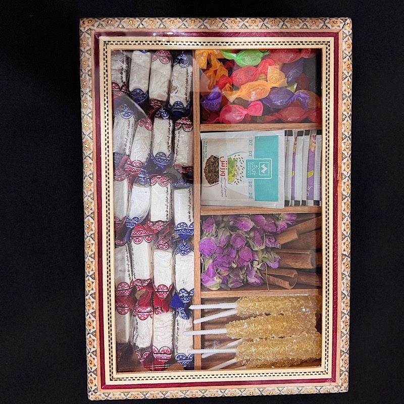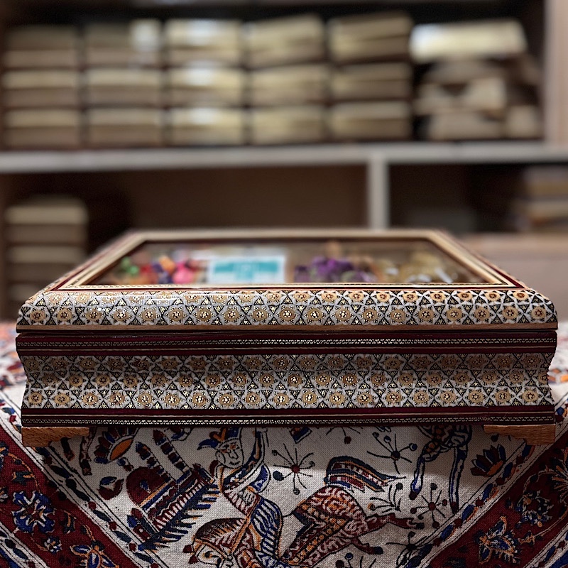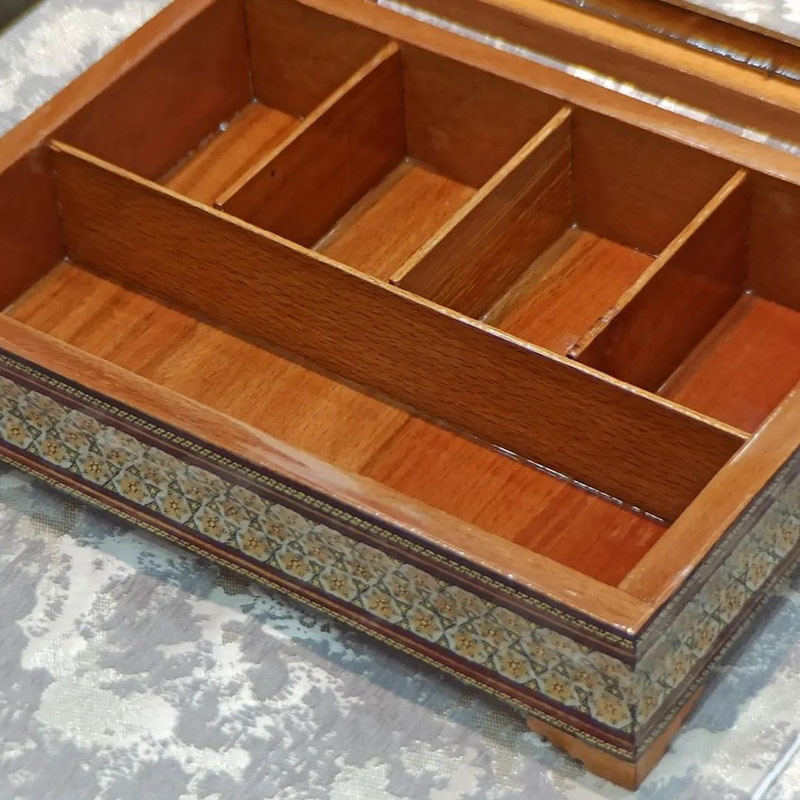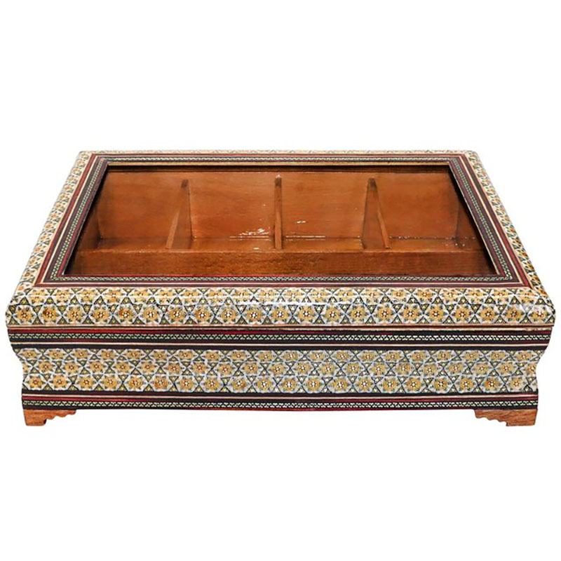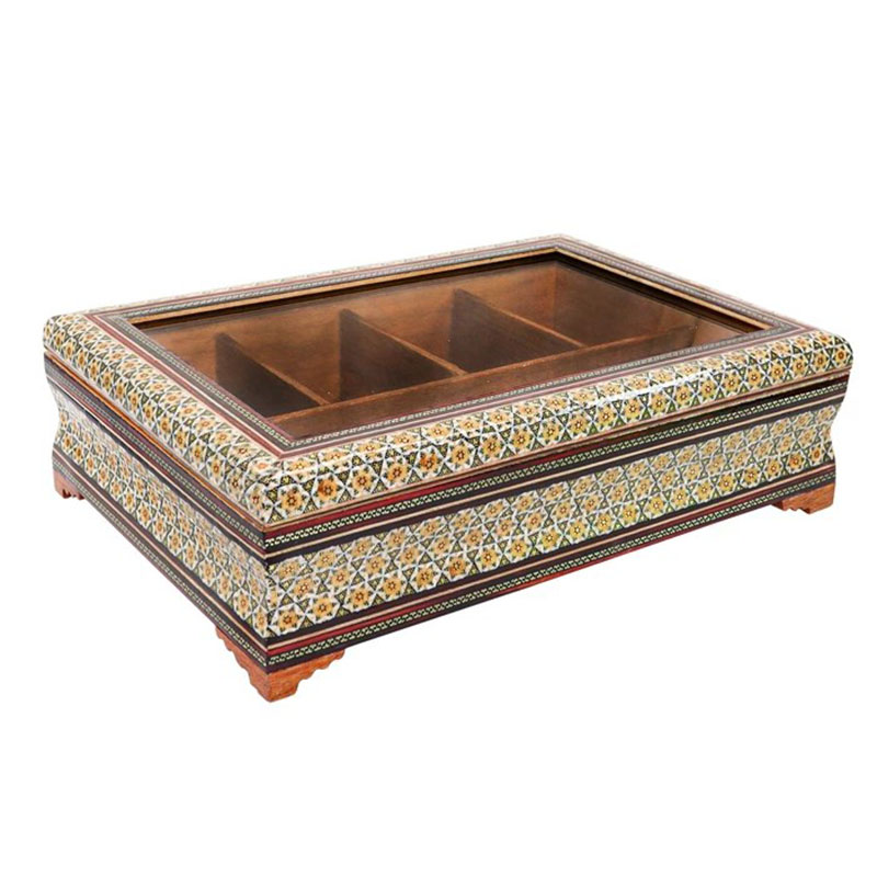 جعبه تی بگ و دمنوش خاتم کاری خورشیدی درب شیشه ای محصولی زیبا و چشم نواز تولید شده در صنایع دستی بُته چی در ساخت این محصول از خاتم طرح خورشیدی و پر سیم و استخوان استفاده شده است. دارای 5 قسمت برای قرار دادن انواع دمنوش و… باضمانت اصالت و فیزیکی محصول این جعبه با طول و عرض 32 در 22 سانتی متری و ارتفاع 9 سانتی متر با درب شیشه ای ، پذیرایی خاص و لاکچری برای مهمان شما به همراه می آورد.
