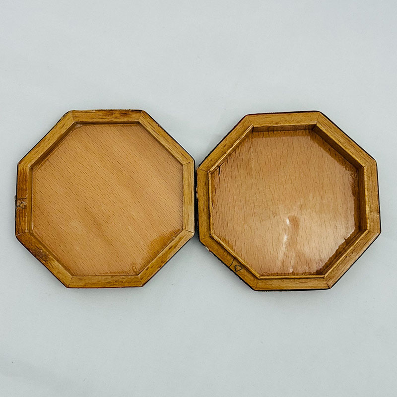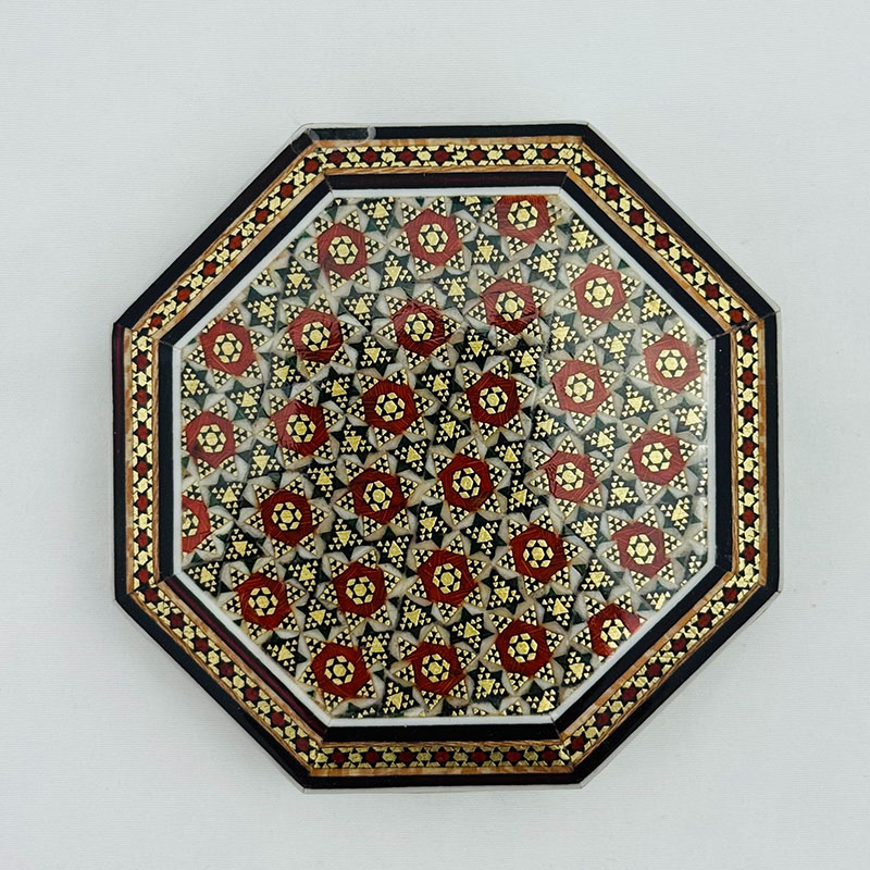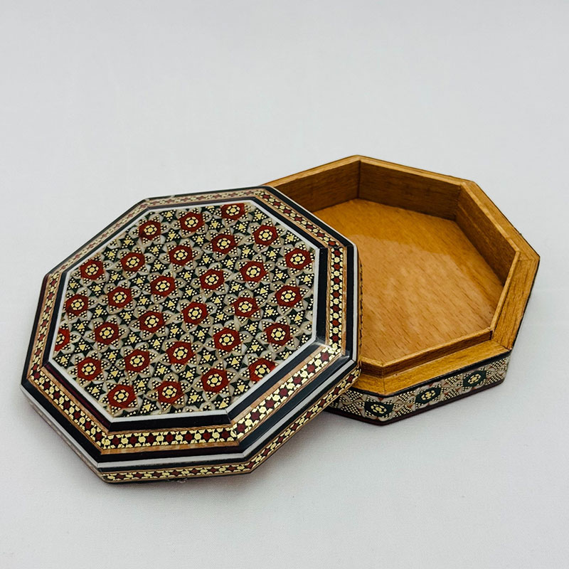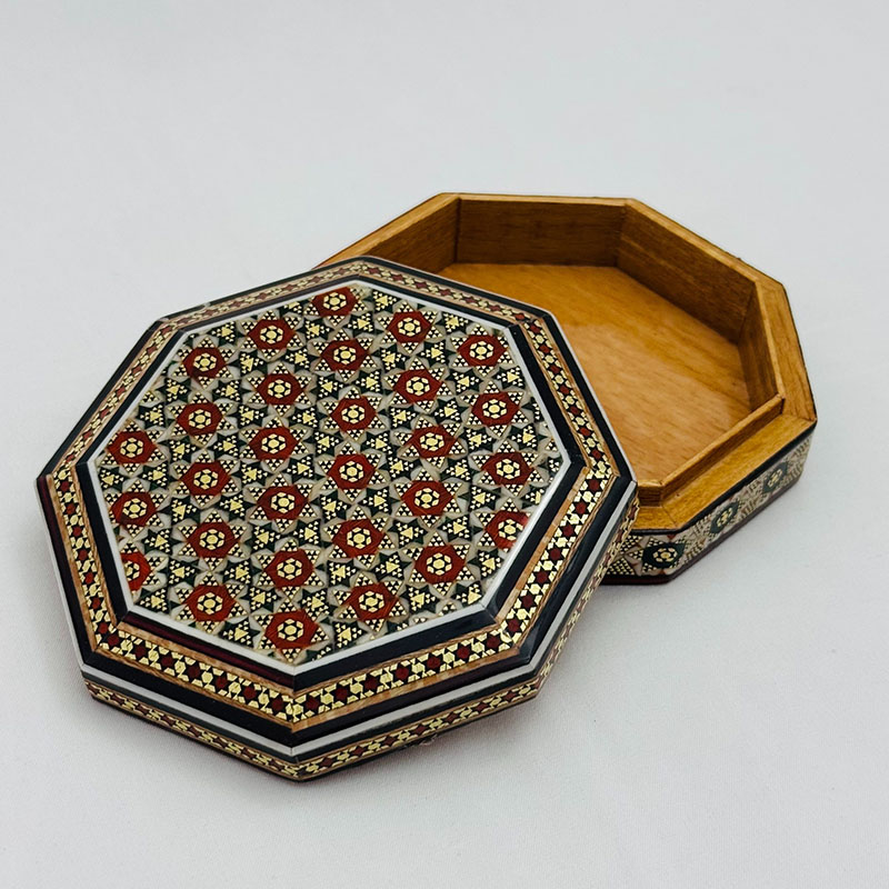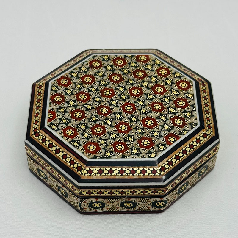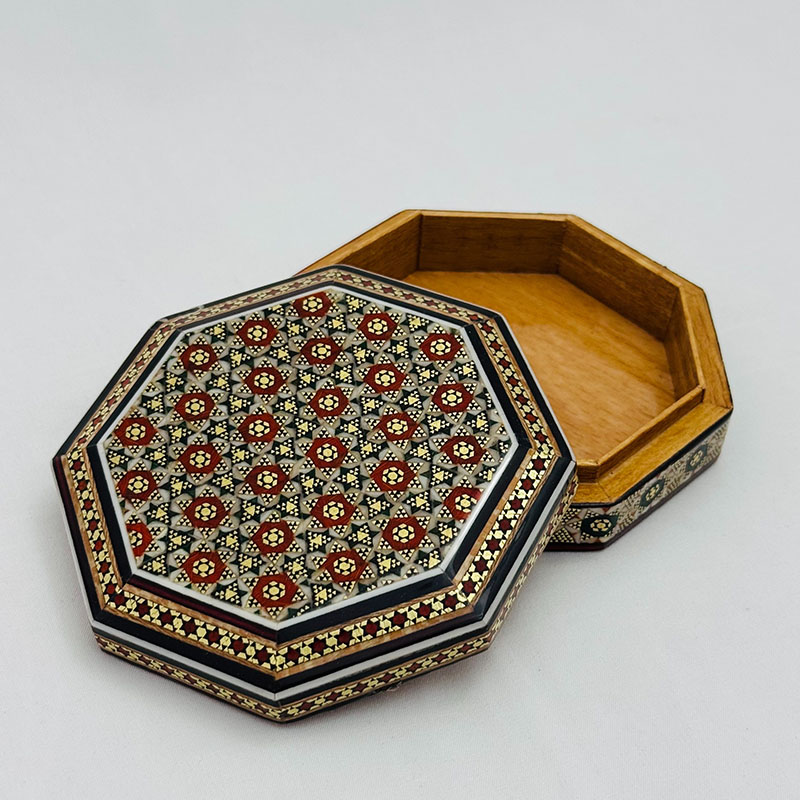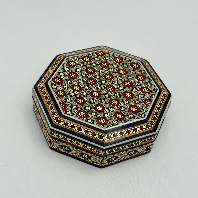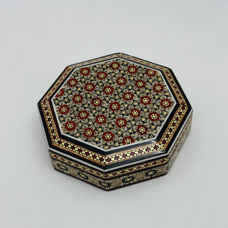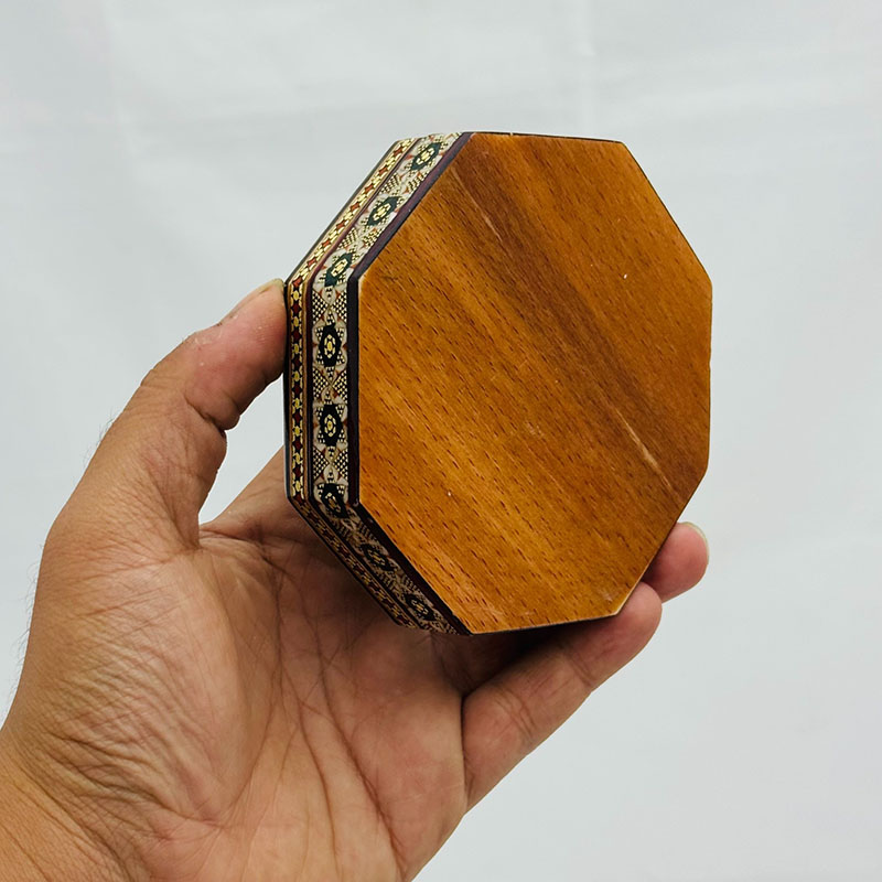 ابعاد کلی: قطر 11 و ارتفاع 3 سانتیمتر ابعاد قسمت داخلی جعبه: 9 × 8.5 ×2 سانتیمتر این جعبه النگویی فرمی هشت ضلعی دارد.قسمت خارجی بدنهی جعبه خاتمکاری شده و قسمت داخلی آن از جنس چوب است. این جعبه کوچک و نفیس از خاتم کاری ظریف بهره مند بوده که به خوبی از کادوی شما حفاظت می کند. انتخابی اصیل و هنرمندانه برای قرار دادن جواهرات مانند النگو ، دستبند و .. جنس بدنه چوب