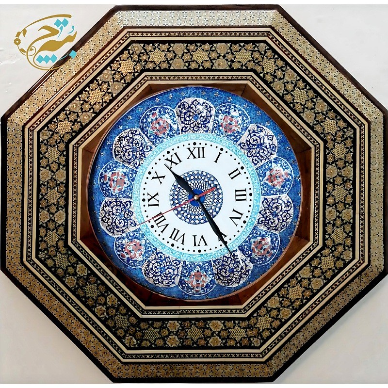ساعت دیواری خاتم کاری هشت گوش ستاره قطبی به همراه صفحه میناکاری شده قل دار(ساده نیست) ، قطر صفحه داخلی این ساعت ۲۵ سانتی متر و قطر کامل این ساعت دیواری ۴2 سانتی متر است بر روی کل کار پس از خاتم کاری، سه لایه پلی استر زنی شده تا جلوه و دوام کار دو چندان گردد.